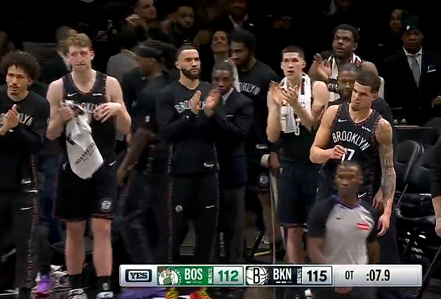加时赛中,杰伦-布朗撤步三分不中,凯尔特人还剩8秒落后篮网5分。