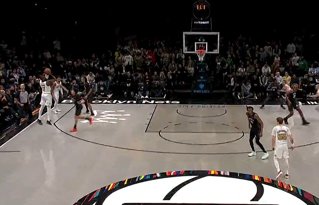 杰伦-布朗撤步三分不中,凯尔特人还剩8秒落后篮网5分