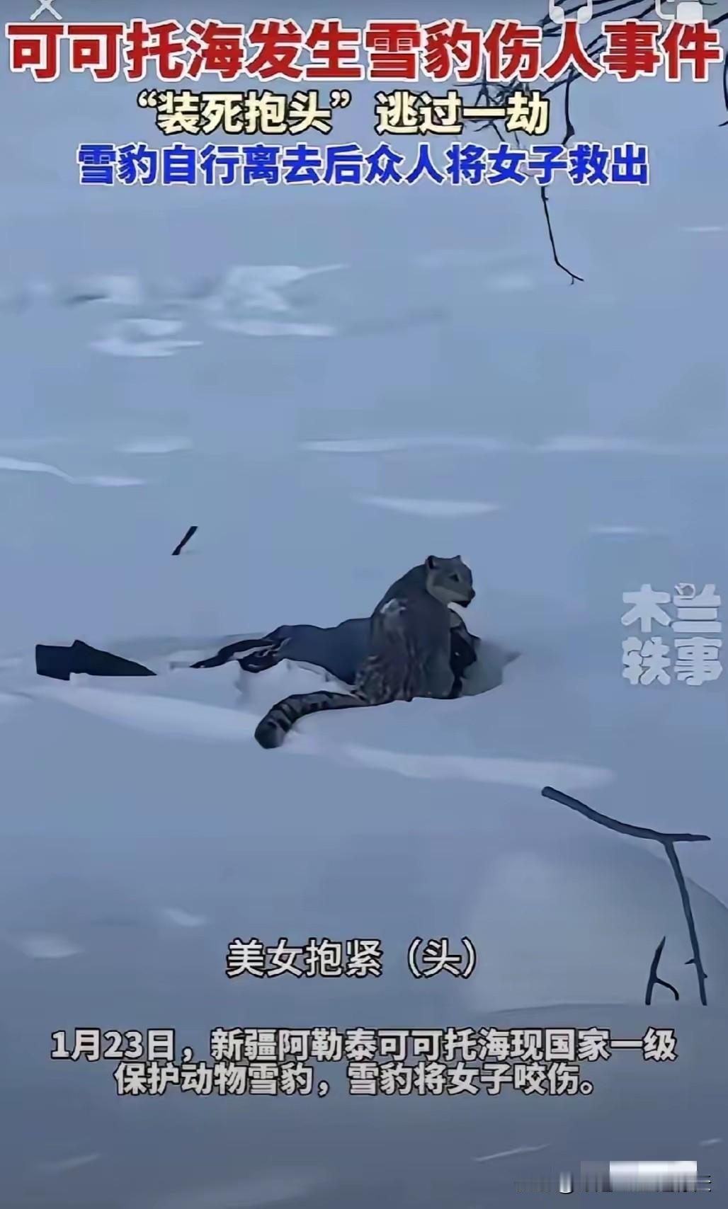 1月23日,新疆阿勒泰可可托海发生雪豹伤人事件,一只雪豹把女子扑倒在地,当人们发现这一幕时,都大声喊叫,雪豹回头看看,也不怕人,女子机智的抱着头,靠装死逃过一劫,最后雪豹离开,女子已到当地就医。 最新消息显示,这位受伤的女游客事发时身穿紫色滑雪服,被雪豹咬伤以头部面部,现场群众第一时间拨打了120和报警电话,她被众人搀扶着走出雪地时,衣襟上满是血迹,头部经过简单包扎后等待救援 。当晚她被紧急送往富蕴县人民医院急救,官方通报明确,伤情平稳,不过考虑到伤口处理和后续治疗需求,她已转往乌鲁木齐的医院接受进一步救治,富蕴县应急管理局工作人员证实目前情况良好 。值得一提的是,医生曾提示野生动物咬伤可能存在迟发性损伤风险,后续还需密切观察伤口愈合和感染情况,这也给所有游客敲响了警钟,野外遇兽的风险,远不止当下的咬伤。 女子的机智让她逃过一劫,但千万别把装死当成通用避险技巧!这次事件给所有冬季去山区、草原出游的人提了个醒:野生动物靠近时,正确的应对比运气更重要,这3个安全细节能帮你避开风险。 景区预警真的要当回事!事发前6天,可可托海景区就通过红外相机拍到了这只雪豹,不仅在公众号发了预警,还在宝石沟路段(事发地)设了3块警示牌,广播每15分钟循环提醒不要下车、快速通过 。可总有游客觉得,难得见到雪豹,拍张照再走,甚至有人打开车门近距离拍摄,要知道野生动物的攻击往往发生在3秒内,你拿出手机的功夫,就可能触发它的防御本能。更关键的是事发地并非景区内,而是雪场返回宾馆的必经之路,景区闭园后这段区域的防护更需游客自觉遵守提示 。 牢记三倍距离法则,和避险动作。中国野生动物保护协会明确建议,遇到雪豹、熊等猛兽,安全距离至少是它体长的30倍(雪豹体长约1.3米,安全距离要超39米)。如果不慎靠近,千万别跑(奔跑会触发猛兽捕猎本能)也别弯腰下蹲(容易被误认成猎物)要立刻站直身体、张开双臂,让自己看起来更大只,缓慢后退,同时轻声说话(别大喊大叫,避免激怒对方)像事发女子那样抱头装死,只适用于雪豹这类非食腐类猛兽,遇到熊可千万别试! 还要注意景区的危险信号。冬季去山区旅游,只要看到野生动物频繁出没,禁止露营,夜间禁行等提示,就一定要遵守。这次事发地周边,景区早就标注了,雪豹活动核心区,疑似同一只雪豹前一天还现身过附近民宿草场,推测是觅食困难才靠近居民区 。另外尽量结伴而行,不要单独进入偏僻路段,随身携带强光手电、哨子等避险工具,遇到情况能及时发出信号。 有人说生态好了才会遇到猛兽,这话没错。但生态向好不代表我们能肆意打扰野生动物的生活,游客的侥幸心理,可能要付出受伤的代价。那位转院治疗的女游客,原本的滑雪假期被意外打断,后续还要面临伤口护理和恢复,这样的教训实在深刻。 冬季出游本是为了放松心情,别让侥幸心理酿成遗憾。记住:景区的每一条预警都是血泪教训总结来的,野生动物的每一次靠近都不是友好互动。遵守规则、保持距离、掌握避险技巧,才能在欣赏自然之美的同时,守住自己的安全底线。