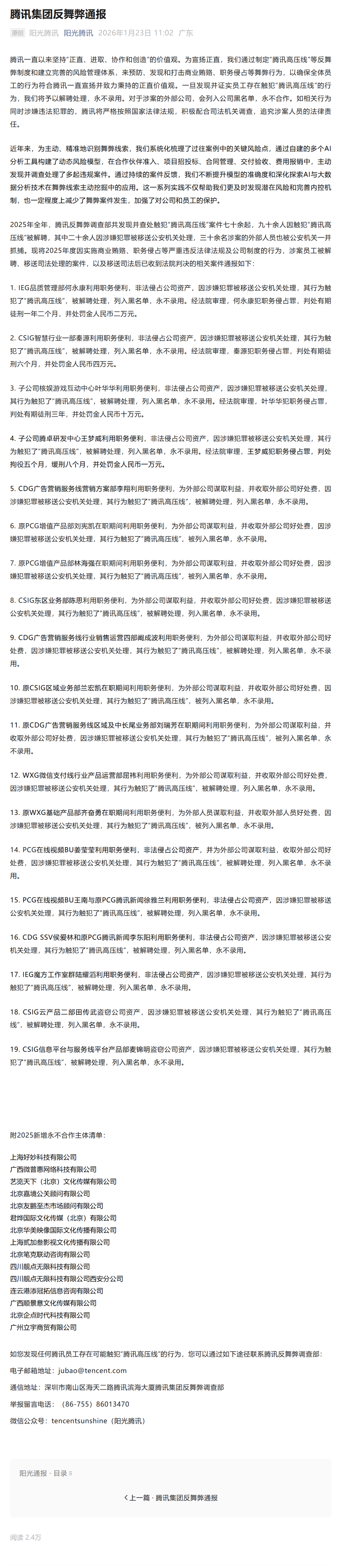 腾讯在说:“2025年我们又抓了一批‘内鬼’和行贿的外部公司,该开除的开除,该送官的送官,绝不留情。”