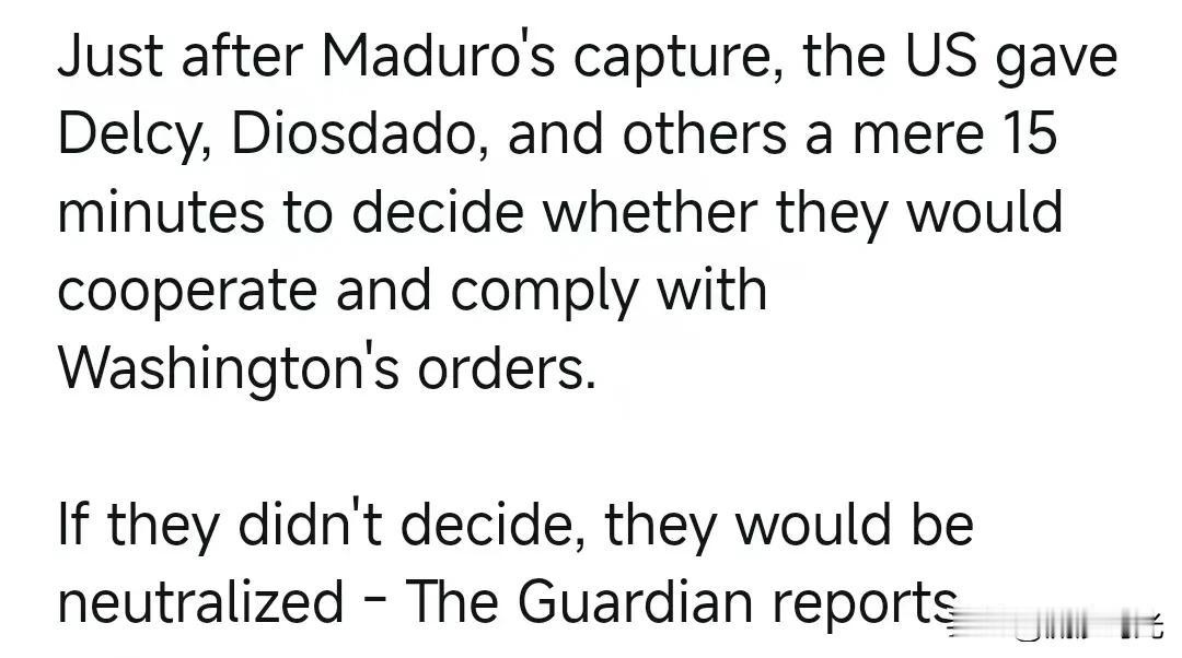 马杜罗被捕后,美国只给了德尔西、迪奥斯达多等人 15 分钟时间来决定是否合作并服从华盛顿的命令。 如果他们不做出决定,他们将被消灭——《卫报》报道。