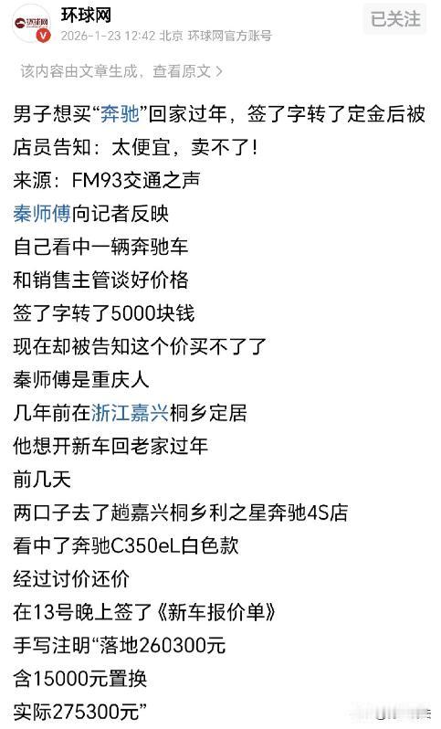 浙江嘉兴。秦师傅为过年回家体面,打算买车犒劳自己。他和妻子到4S店看中奔驰C350eL,经讨价还价以275300元谈妥,旧车置换享15000元补贴后实际260300元。秦师傅转5000元定金,销售人员回复收到,却未点收款,24小时后定金被退回。提车时4S店称车子涨价了,现在,早的价格已经不能卖了。 (来源:环球网、1818黄金眼) 秦师傅一年到头辛苦打拼,就盼着过年能风风光光地回家。他琢磨着买辆新车,既是对自己辛苦一年的犒劳,也能让回家更有面子。于是,秦师傅拉着妻子,兴致勃勃地来到了4S店。 一进店里,秦师傅和妻子的目光就被一辆白色的奔驰C350eL吸引住了。这车外观时尚大气,配置也不错,秦师傅越看越喜欢。 销售人员见状,赶忙过来介绍,秦师傅和妻子也跟销售人员讨价还价起来。经过一番激烈的唇枪舌战,最终以275300元的价格谈妥了。 而且,秦师傅还有旧车可以置换,能享受15000元的补贴,算下来实际只要260300元,还送不少东西呢,这可把秦师傅高兴坏了。 秦师傅当下就决定交定金,他通过转账转了5000元,还特意在备注里注明定金。销售人员很快回复收到,秦师傅心里踏实多了,就带着妻子回家了。 可谁能想到,回家后秦师傅查看账户,发现那5000元定金居然被退回来了。 他赶紧联系销售人员,销售人员一开始说车在申请价格,让秦师傅别着急。可没过多久,销售人员又改口说车子涨价了,这个价格卖不了了。 这可把秦师傅气坏了,他觉得4S店太不地道了,明明都谈好了价格,也交了定金,怎么能说变就变呢? 秦师傅要求4S店按照之前谈好的价格履约,可4S店的经理却说报价单不是合同,定金也没收,所以不算数。 4S店到底有没有责任,按照原价卖车呢? 4S店觉得报价单不是合同,定金也没实际收取,所以他们可以随意改变价格。 可秦师傅认为,双方都已经谈好了价格,自己也交了定金,4S店就应该遵守约定。 从秦师傅的立场来看,他是诚心诚意想买车,而且也按照流程交了定金,4S店突然变卦,这让他很被动。他的依据就是双方已经达成了买卖的合意,4S店不能随意反悔。 那4S店又是怎么想的呢?他们觉得销售只是让秦师傅交意向金去申请价格,如果价格申请不下来,钱就会退回去。 而且销售没搞清楚车型底价,导致出现这种情况,这是销售的失职,和店里无关。 法律分析: 秦师傅和4S店谈好了车价,交了定金,可4S店却以车子涨价为由拒绝按原价卖车,这中间涉及到了合同成立以及定金的问题,从法律角度该怎么解决呢? 秦师傅和4S店经过讨价还价确定了车价,秦师傅也转了定金,可4S店却反悔,这涉及到合同是否成立以及定金是否生效的问题。 秦师傅认为双方已经达成买卖合意,合同成立,4S店应该履约;而4S店却认为报价单不是合同,定金也没实际收取,合同不成立。 根据《民法典》第四百七十一条规定,当事人订立合同,可以采取要约、承诺方式或者其他方式。 4S店给出车价等交易条件,这可以看作是要约;秦师傅同意这个价格并交定金,这可以看作是承诺。当承诺生效时,合同就成立了。 虽然4S店说报价单不是合同,但双方的行为已经符合合同成立的要件,所以合同应该是成立的。 根据《民法典》第五百八十六条规定,当事人可以约定一方向对方给付定金作为债权的担保。定金合同自实际交付定金时成立。 秦师傅转了5000元定金,虽然销售人员没点收款导致定金退回,但秦师傅有转账记录和备注“定金”,这可以证明他有交付定金的意思表示。 而且销售人员回复“收到”,也可以看作是4S店对定金的认可。所以定金合同应该是生效的。 如果合同成立且定金生效,按照法律规定,收受定金的一方不履行债务或者履行债务不符合约定,致使不能实现合同目的的,应当双倍返还定金。 4S店拒绝按原价卖车,属于不履行债务,应该双倍返还秦师傅的定金。 这事,虽然最后没有明确的结果,但从法律角度来说,4S店的行为是不合理的,秦师傅可以通过法律途径维护自己的权益。 在这件事里,4S店的销售有没有责任呢?要是您是秦师傅,遇到这种情况会怎么办呢? 您觉得报价单能不能算合同呢?要是您是4S店经理,又会怎么处理这件事呢? 最后,4S店还是不肯按原价卖车,秦师傅没办法,只能另寻他车。 您对这件事有什么看法呢?