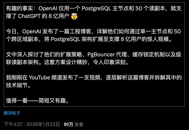 支撑全球8亿ChatGPT用户、每秒处理数百万次查询的,竟然只是一个单一主节点的PostgreSQL数据库!