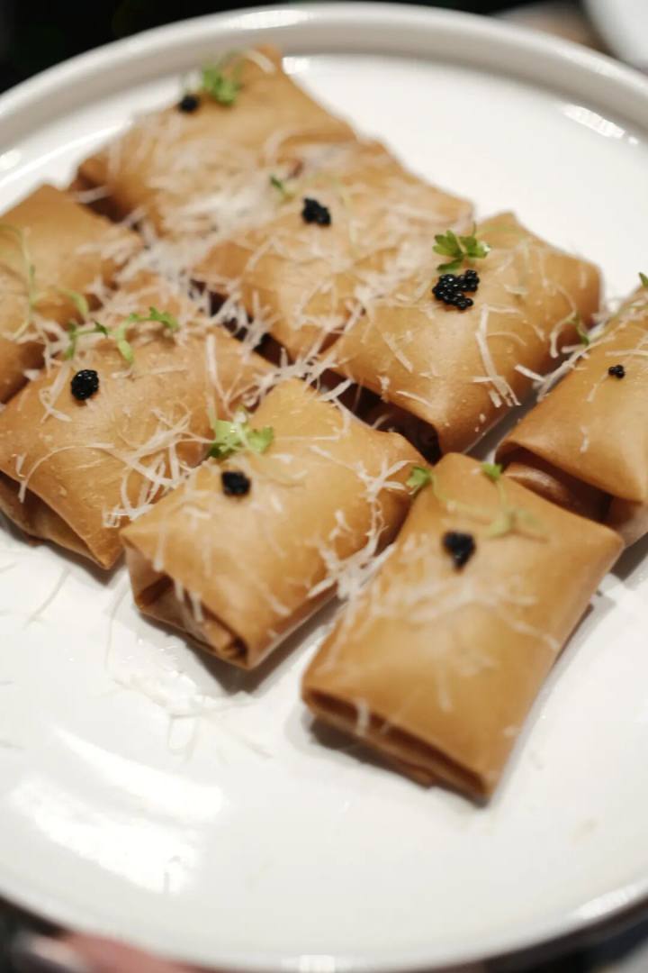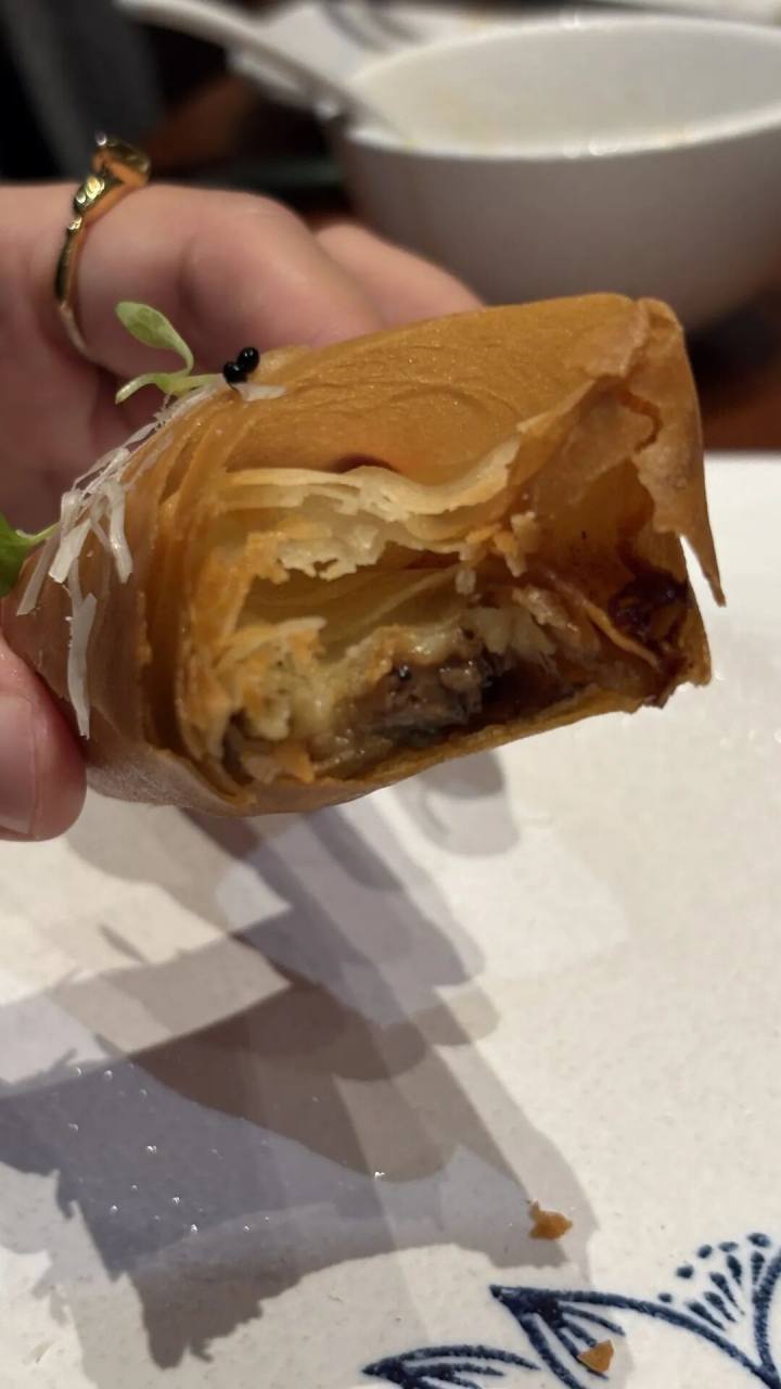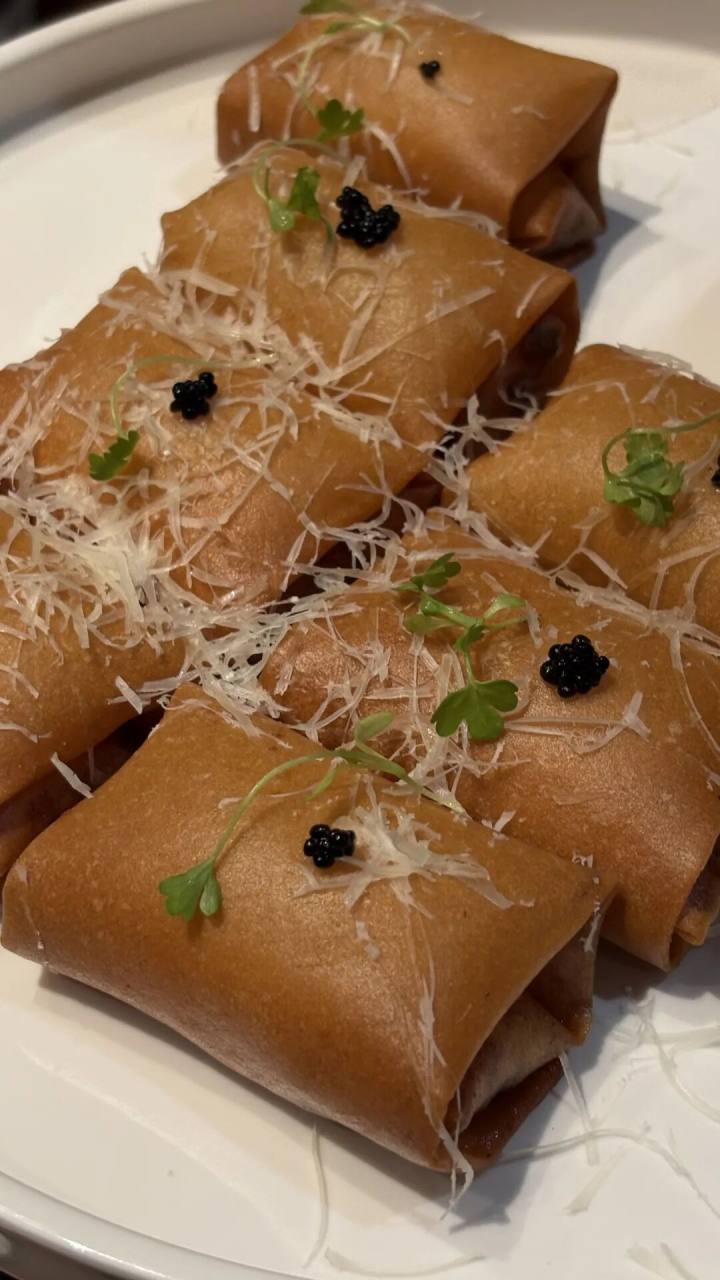 和牛空气春卷,与传统杭帮春卷紧实不同,空气春卷,主打一个胖乎乎,像个枕头包,中空而薄脆。