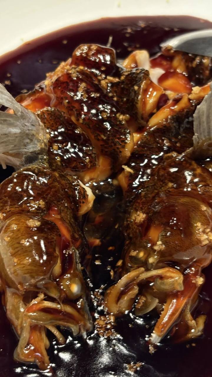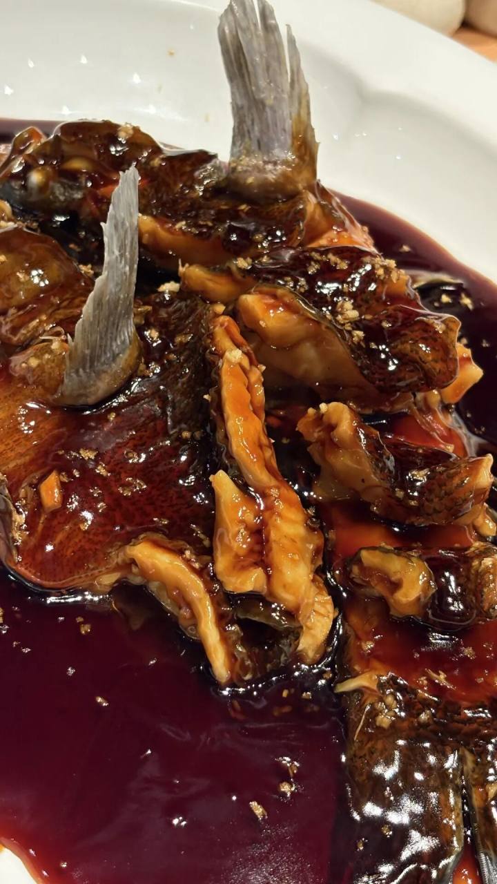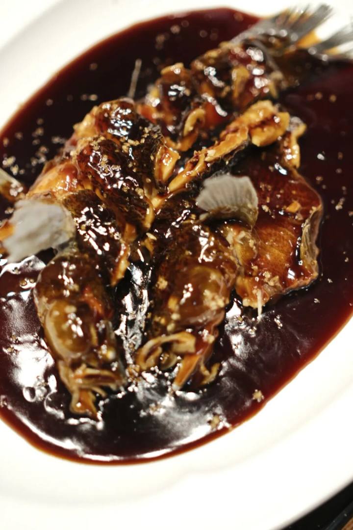 西湖醋鱼用现在很流行的笋壳鱼,特制湖羊酱油,酱色足,糖醋汁透亮,醋香盈室。好坏从肉眼看,上桌要气势雄伟,所有鱼鳍能站起来的全站起来,旌旗堪堪。