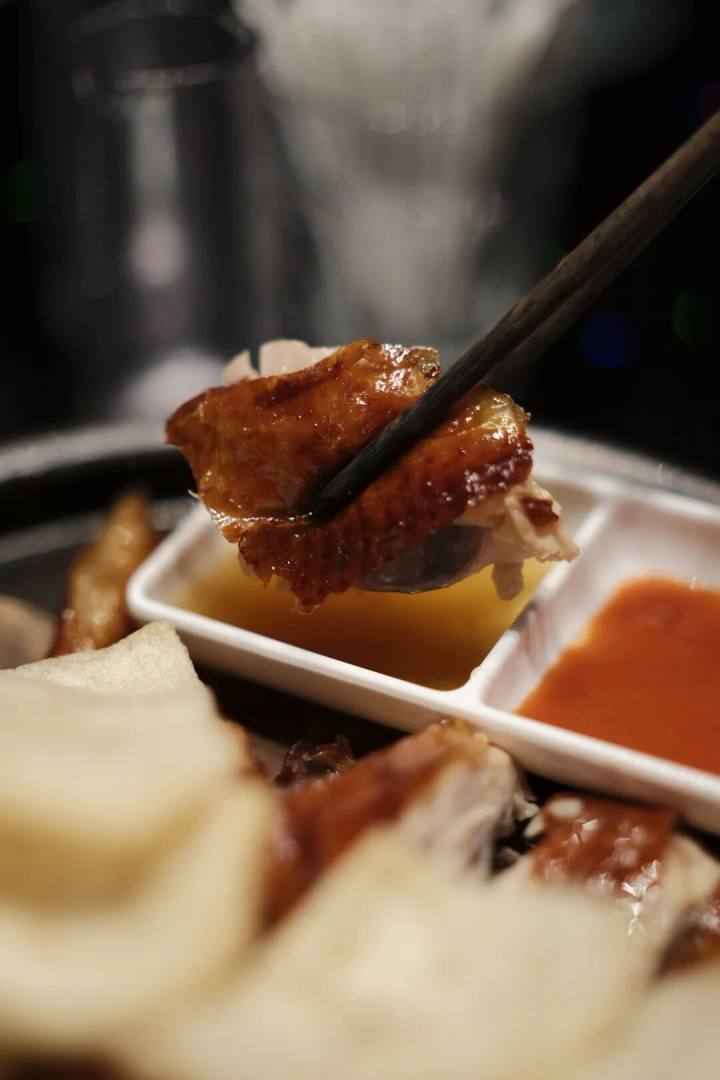 鸡先腌制,风吹六个小时,风吹之前需浇淋皮水,烤制四十五分钟,再用热油淋,形成脆壳。