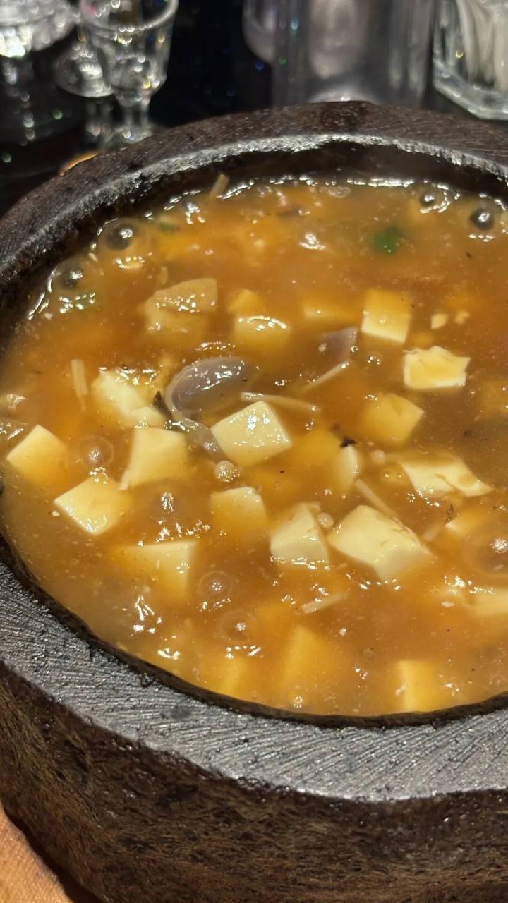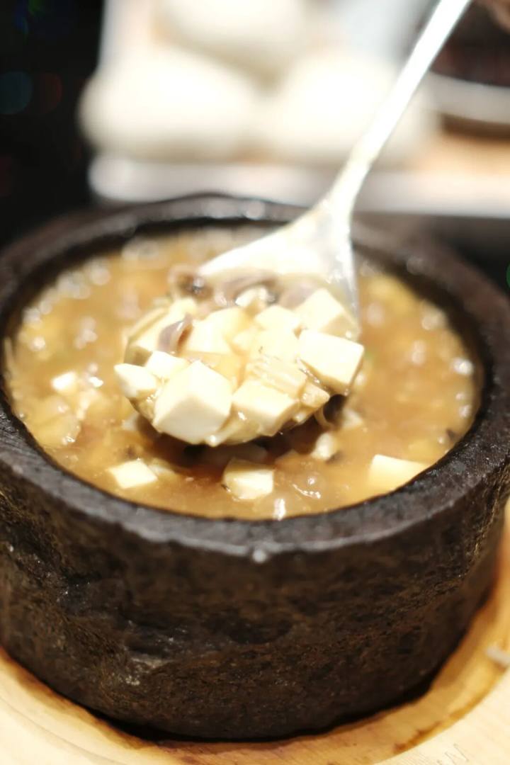 沃豆腐,东阳、诸暨、富阳各地都有,大同小异。番薯粉包芡包得紧。嫩豆腐、金针菇、黑木耳、油渣,熬成一羹,以石锅保温。