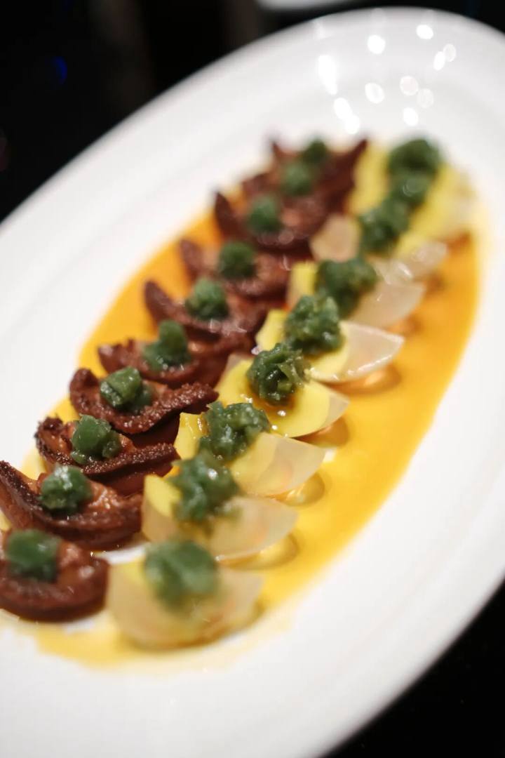 烧椒皮蛋搭配低温慢浸鲍鱼,鲍鱼糯口,皮蛋切成小船形状,鲍鱼切半,露出横截,一一而对,其上略覆烧椒。
