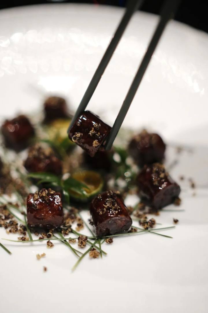 藜麦松板肉,藜麦是一个铺垫,经炒制后,有麦香,皆松脆感。松板肉是猪颈两侧的部位,以其量少,江湖人称“黄金六两”。