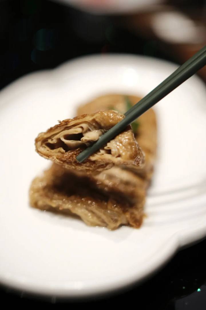 豆腐皮也是专为素烧鹅而订制,外面不大买得到,老的工艺做法,冷餐热作,虽是冷菜,素烧鹅上来也是热的。麻油是灵魂,素烧鹅之味,讲究咸、鲜、甜、重麻油。