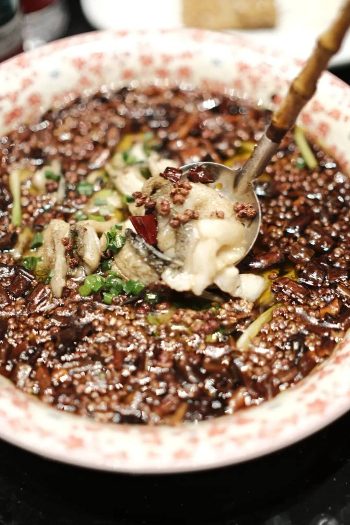 沸腾鱼用老虎斑做,一端上来,一屋子的麻辣椒香,那种滚烫的响油激发出来的辣椒花椒香,掌管你的眼耳鼻舌身意,最后是心猿意马,魂被勾去半个。