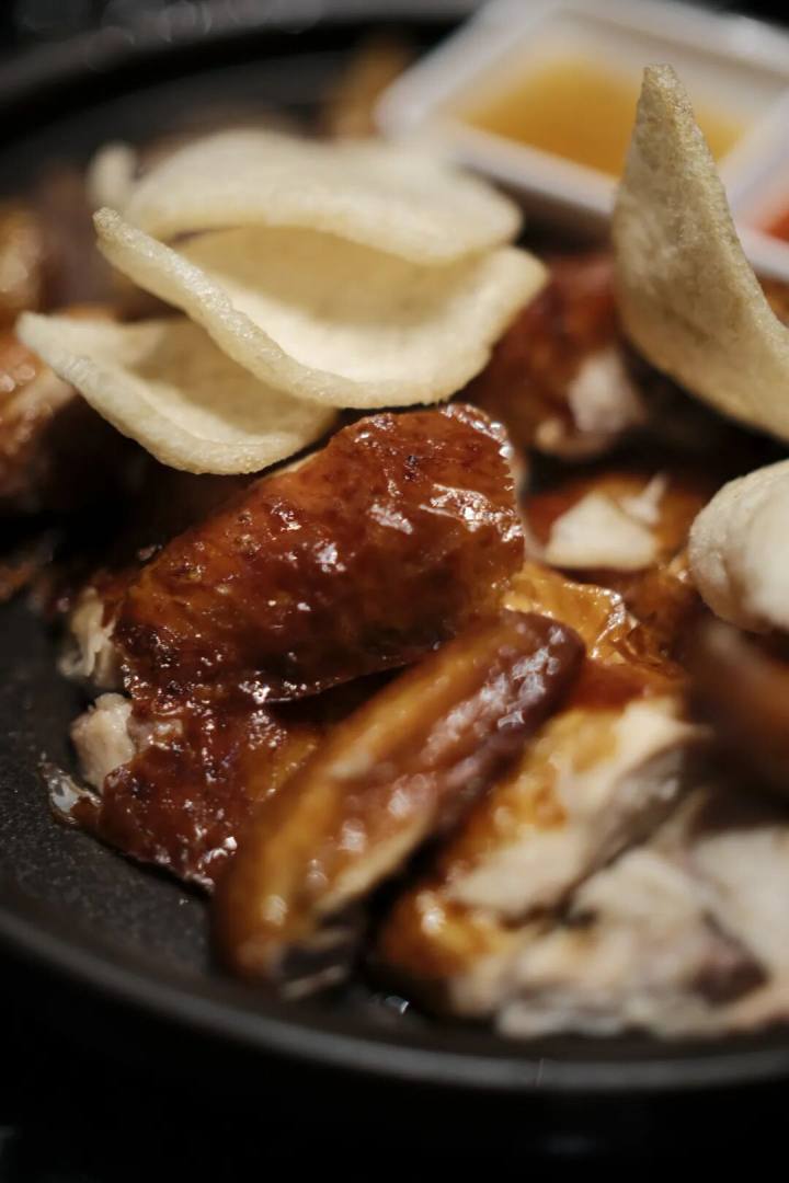 脆皮鸡,粤菜与杭州烤鸡的一个结合,用的童子鸡,以嫩取胜,鸡皮酥薄,鸡肉腴嫩不柴。