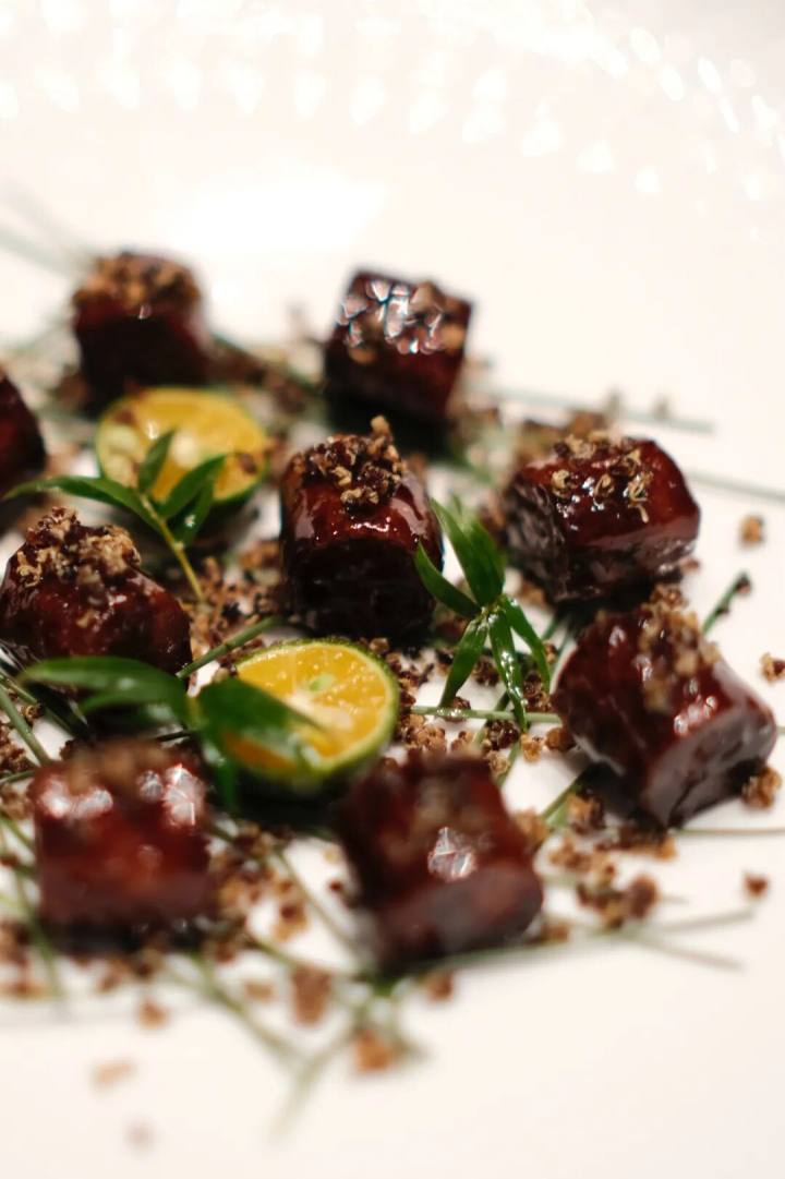 松板肉本身也是松脆的,以酥皮做法,刷酱烤制出一层脆皮。酱烤酥皮略作甜口,沾满藜麦则有去甜腻之意。