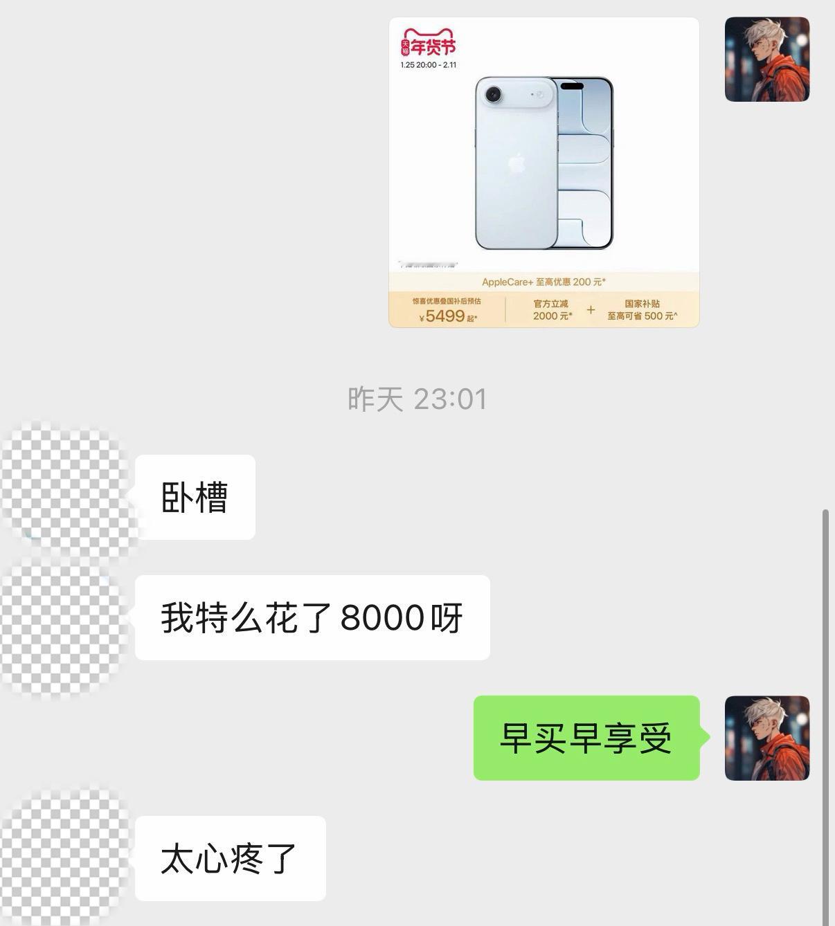 iPhone Air官方价格暴跌2000元 iPhone Air官方降价+国补后5499就能入手,昨晚把这个消息发给冲首发的小伙伴,朋友圈好多人捶胸顿足,已经不能用早买早享受劝人了这次可能是苹果被市场教育得最狠的一次,很难有下一代,想收藏得做好准备,听说这次限量只有1.3万台,如果这个时候拼多多把价格能带到4999就有意思了