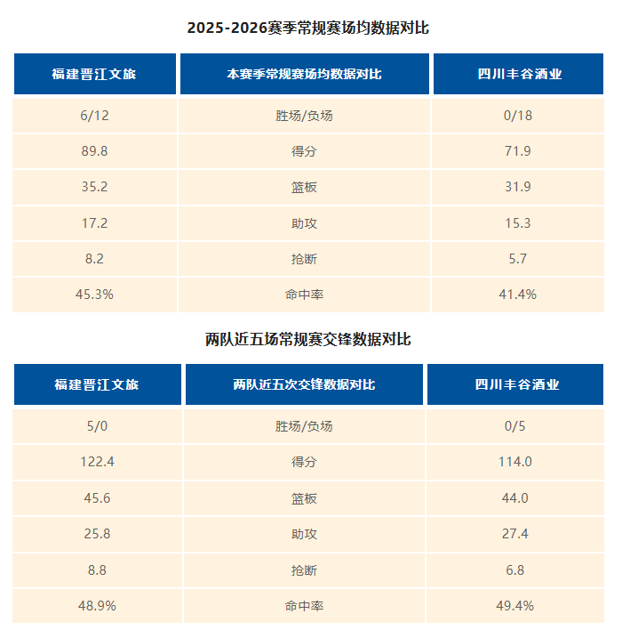 2025-2026赛季CBA联赛第19轮,主队福建晋江文旅男篮坐镇主场迎来四川丰谷酒业男篮的挑战,截止联赛上一轮比赛,主队场均能够轰下89.8分,三分球场均命中9.8记、命中率34.7%,场均35.2个篮板和8.2次抢断均略优于四川丰谷酒业男篮;四川丰谷酒业男篮场均仅得71.9分,失分为96.7分,攻防两端均略处下风。