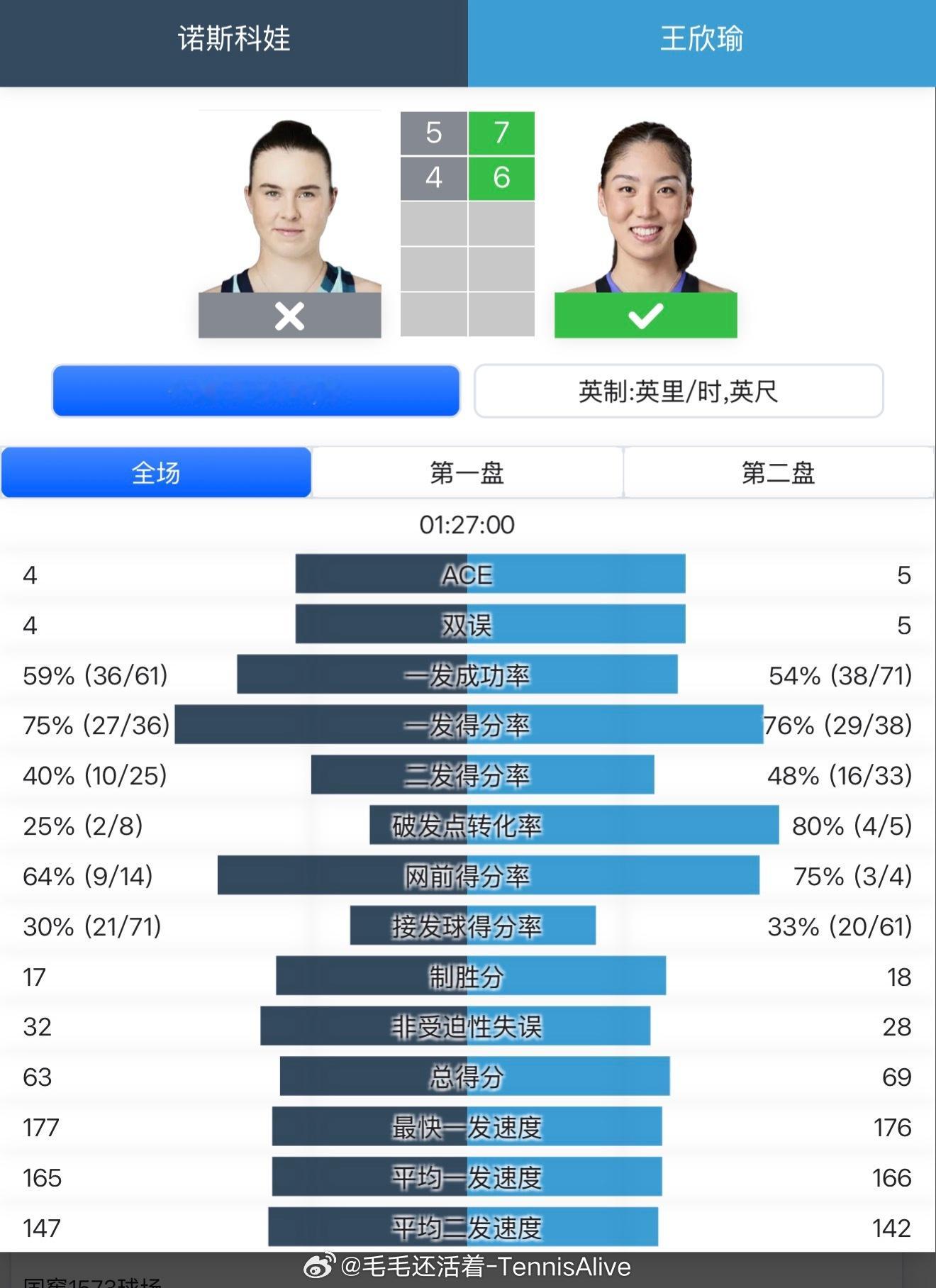 有了上一场比赛应对奥胖的经验。这一场比赛面对诺斯科娃的进攻,王欣瑜打得更游刃有余。底线的防守反击更流畅。在中路深区应对诺斯科娃的进攻也特别稳定。这场比赛没有过山车,偶有小失误。但是都很合理范围,恭喜王欣瑜。下一轮升级版的攻教阿尼西莫娃。王欣瑜首进澳网女单16强这很澳网