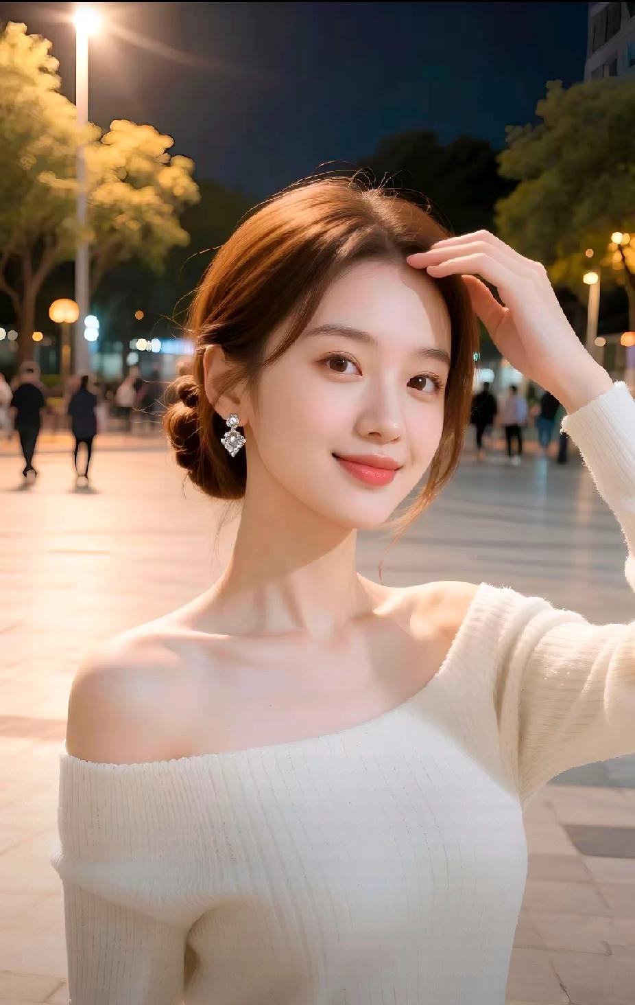 夜晚漫步,温柔微笑,白色毛衣,优雅迷人。
