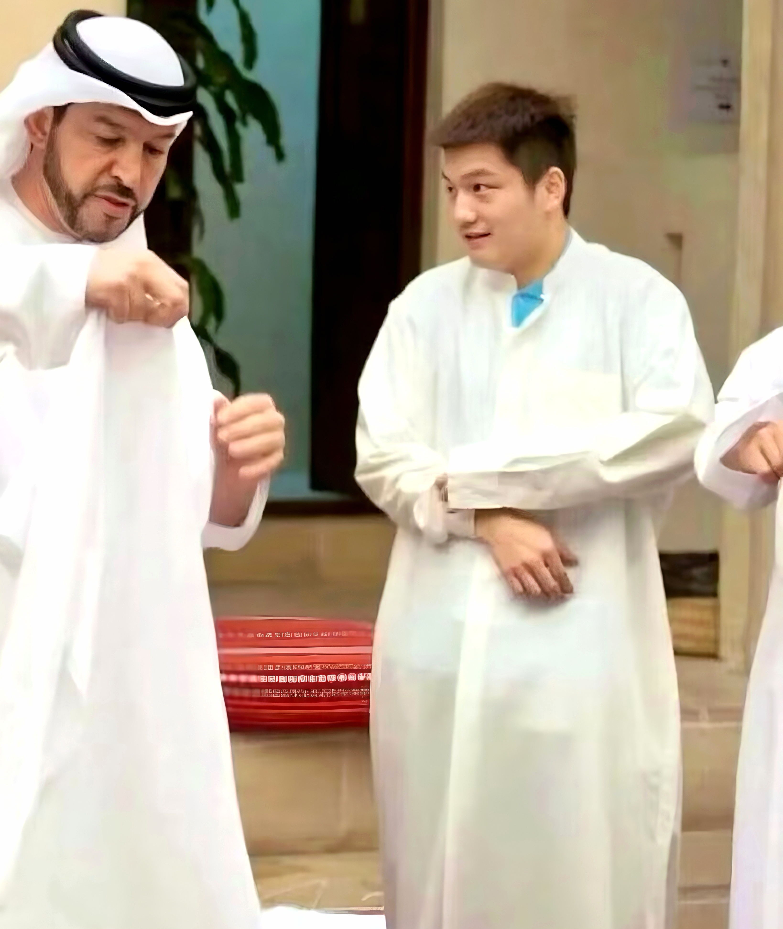 国乒2015年迪拜世界杯团体赛夺冠后,刚成年的咚咚和大自己八九岁的哥哥们玩心大起,换上阿拉伯传统服饰留念。少年东社交平台晒照并调侃:“我像阿联酋的王储吗?”张继科妙回——“默哈默德胖”。人人都爱樊振东有一种想念叫樊振东