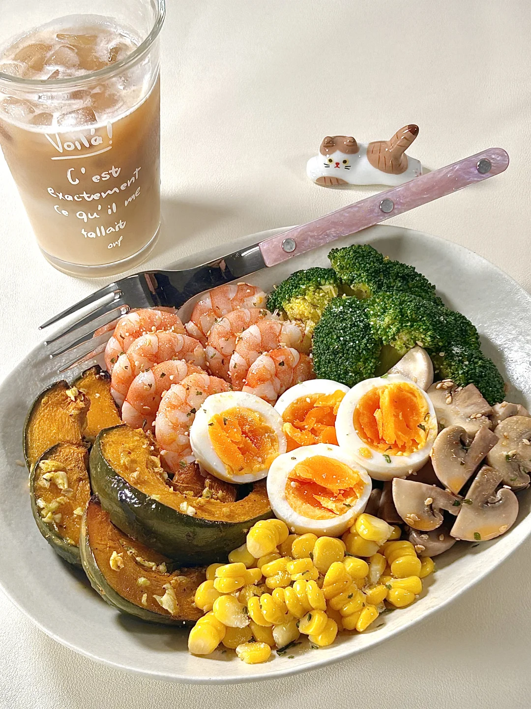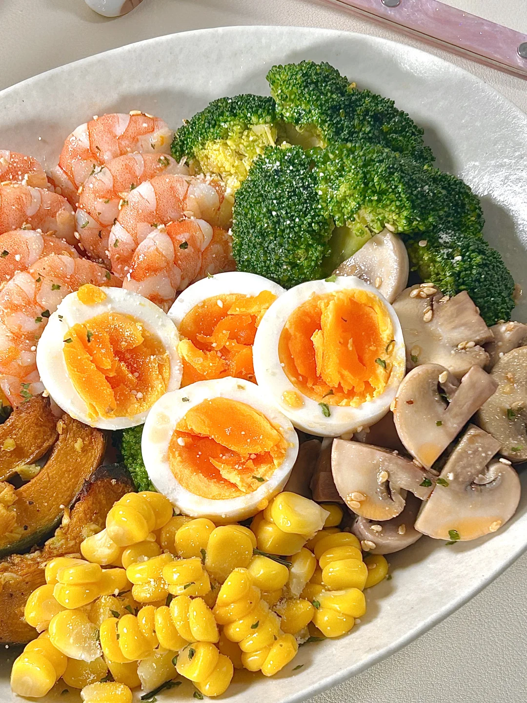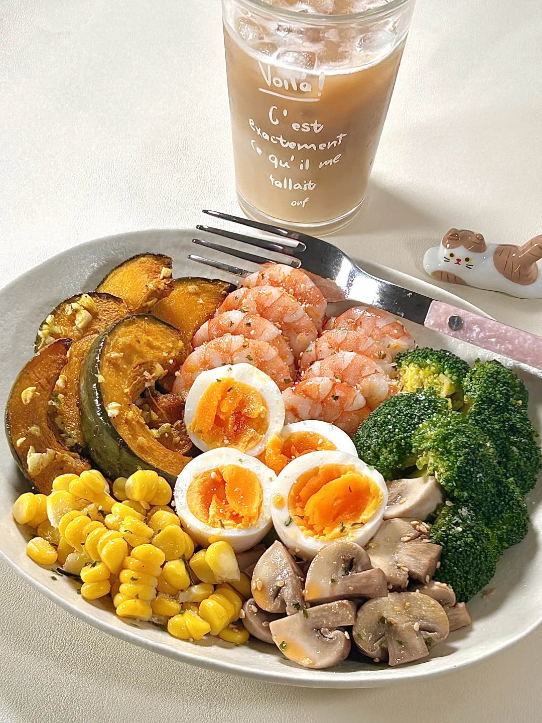 自律餐也要丰富好吃啊😋 优质碳水膳食纤维 高蛋白搭配 低卡又饱腹! 食材:🍤 虾仁+贝贝南瓜+口蘑+鸡蛋+西兰花+玉米 百吃不腻的彩虹沙拉盘 给我香米糊了 烤得焦香的南瓜🎃QQ弹弹的虾仁🍤流心溏心蛋🥚还有脆嫩西兰花🥦鲜掉眉毛的蘑菇🍄🟫再加上甜甜的玉米🌽 一口下去巨满足💯