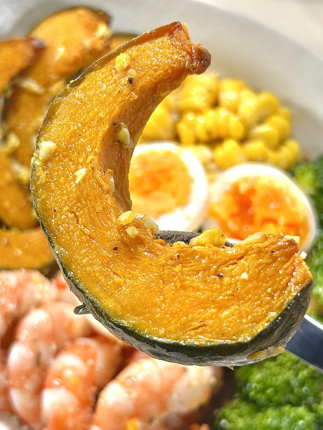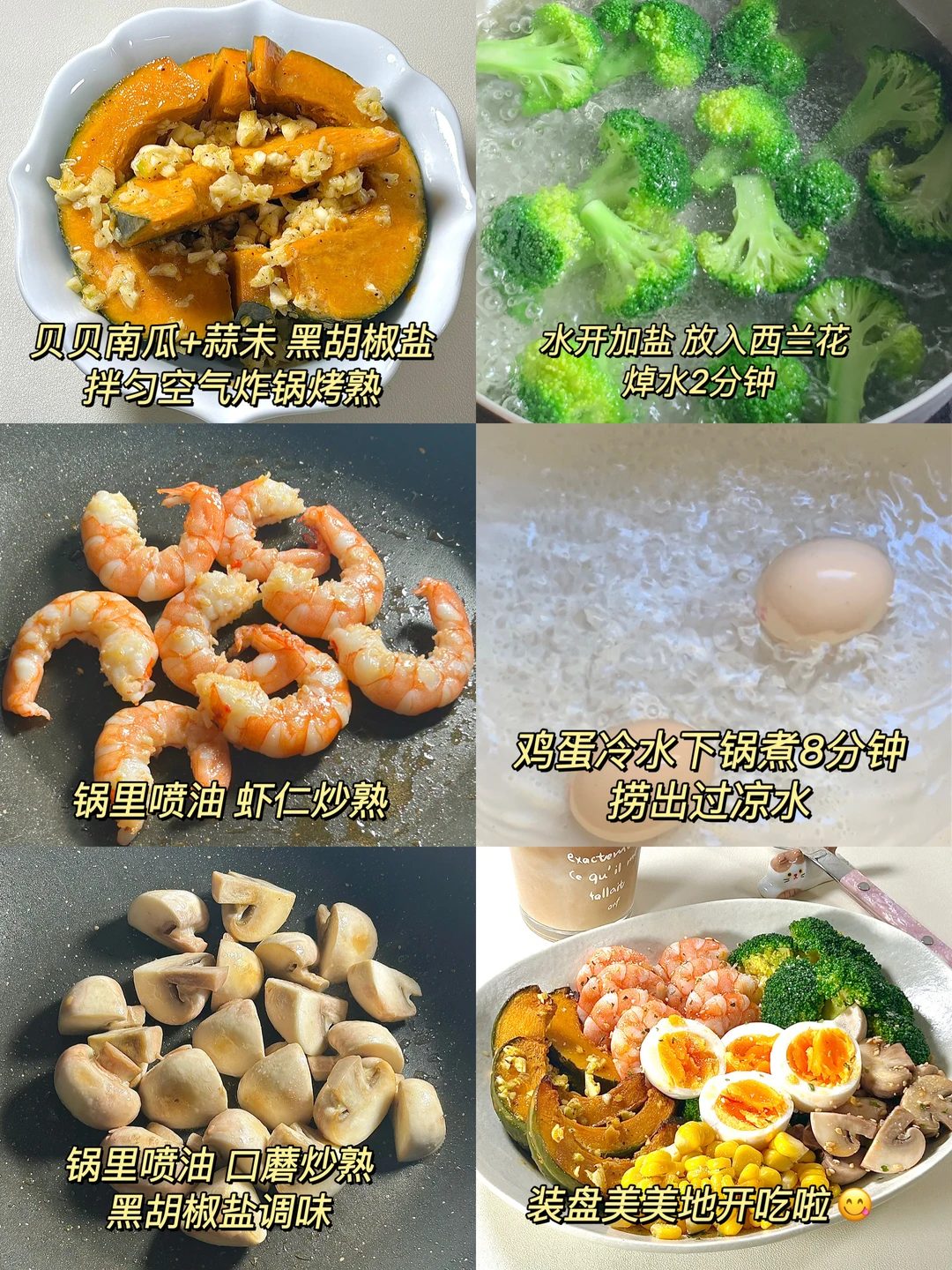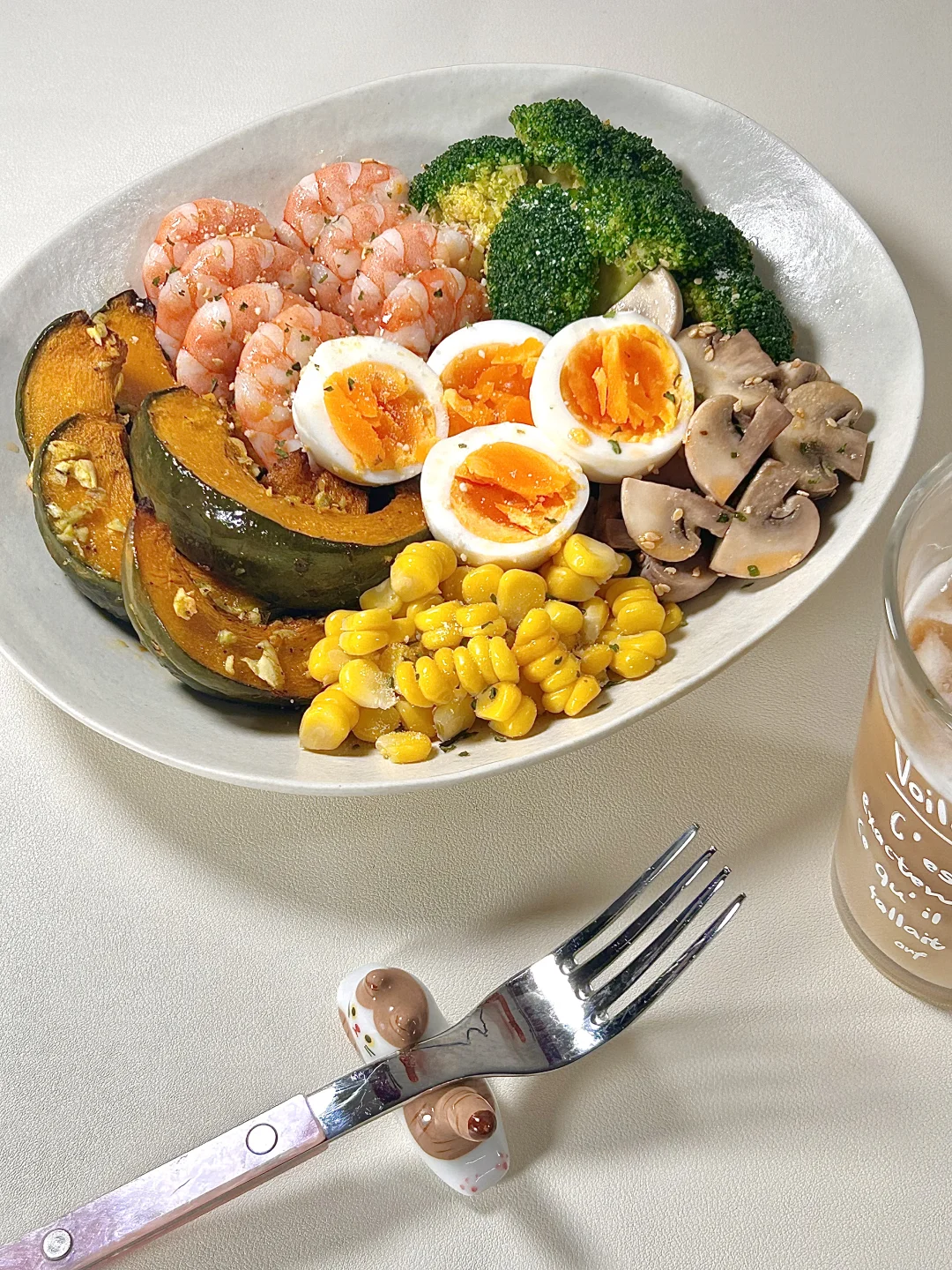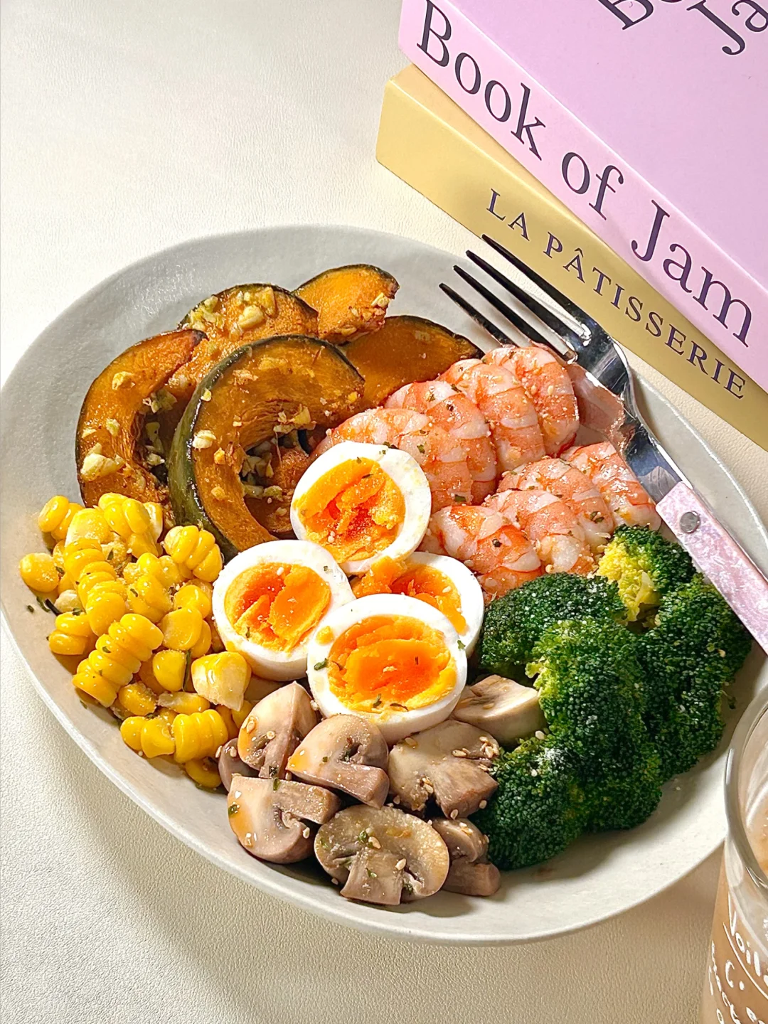 自律餐也要丰富好吃啊😋 优质碳水膳食纤维 高蛋白搭配 低卡又饱腹! 食材:🍤 虾仁+贝贝南瓜+口蘑+鸡蛋+西兰花+玉米 百吃不腻的彩虹沙拉盘 给我香米糊了 烤得焦香的南瓜🎃QQ弹弹的虾仁🍤流心溏心蛋🥚还有脆嫩西兰花🥦鲜掉眉毛的蘑菇🍄🟫再加上甜甜的玉米🌽 一口下去巨满足💯