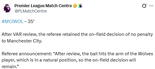主裁判官方判罚说明:“经回看确认,皮球击中狼队球员手臂,但其手臂处于自然摆放位置,因此维持场上原判。”