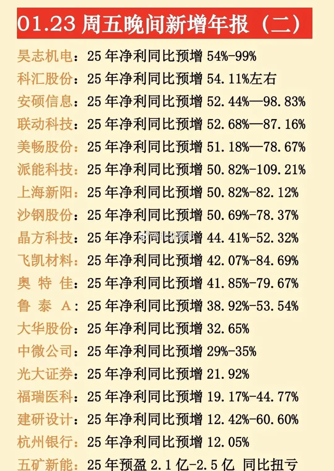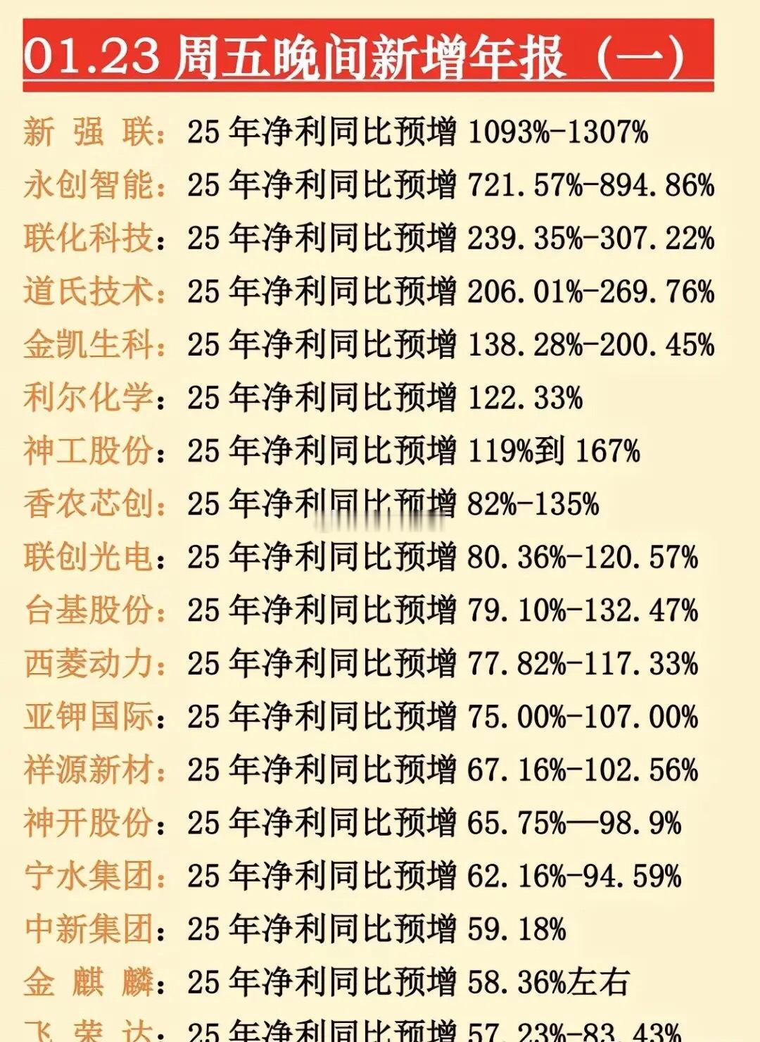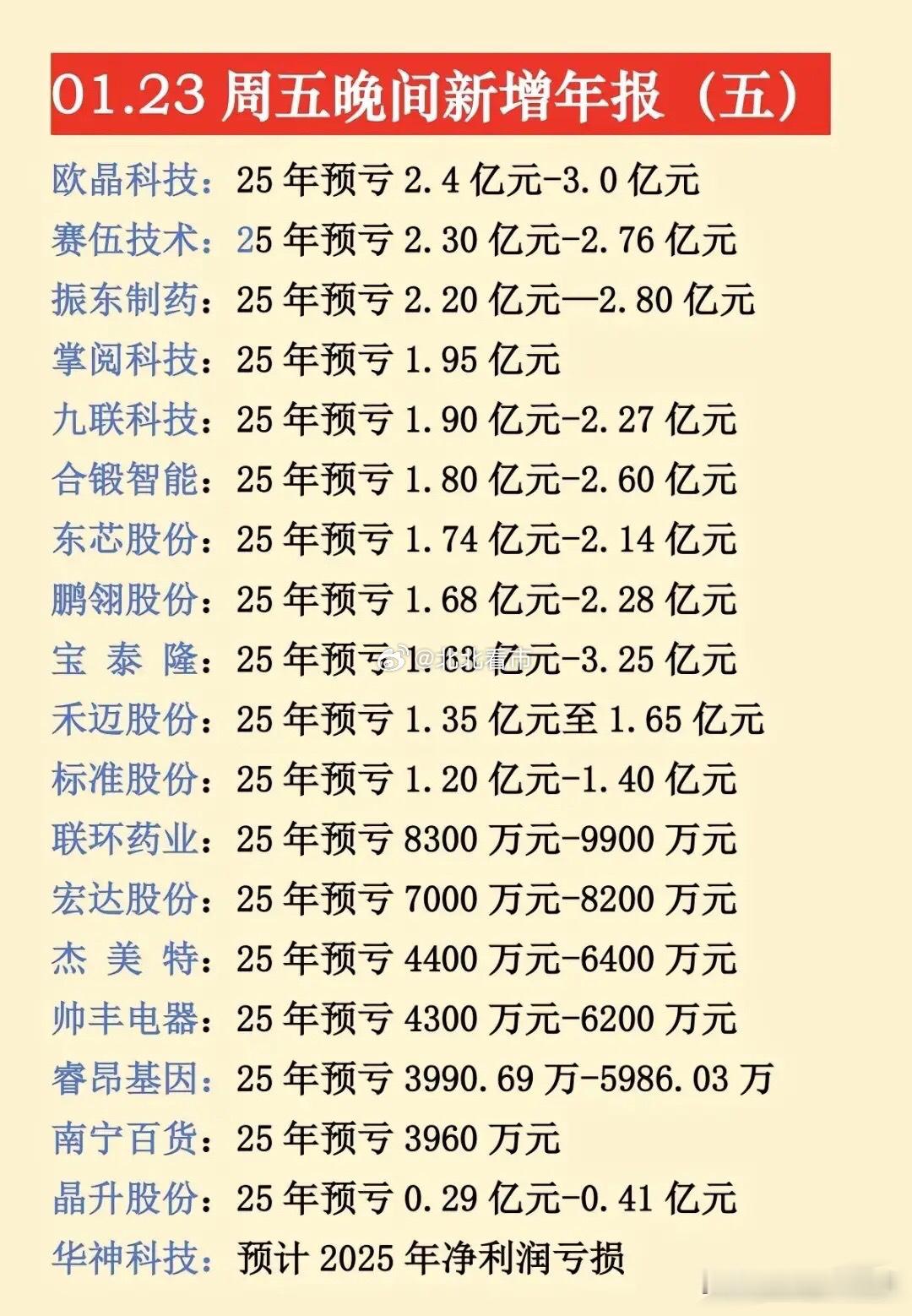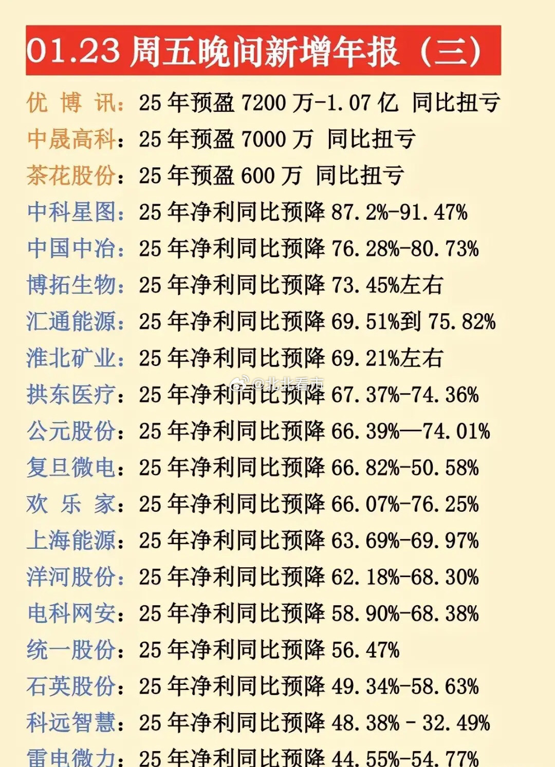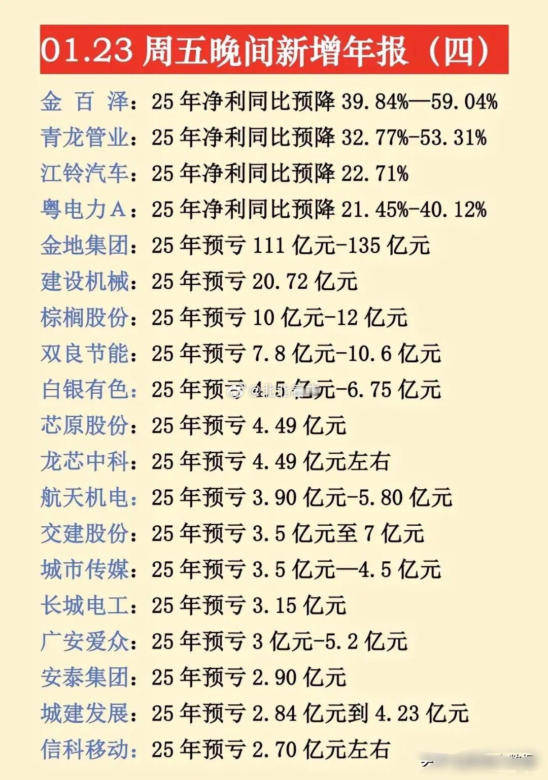 最新年报预告出炉,1月23日晚间更新的数据来了!不少大牛股、央国企龙头年报堪忧,同比大幅预减预亏,注意业绩风险!⚠️预降暴击:中科星图、中国中冶等超20家公司净利润大幅下滑,最高预降超91%,洋河股份等消费龙头也未能幸免。央国企控股预亏预减公司有电科网安、中国中冶、粤电力、航天机电、信科移动、白银有色等等。电科网安作为网络安全领域的国家队,2025年净利润同比预降58.90%-68.38%,是1月23日晚间披露的预降个股之一。航天机电公司背靠航天科技集团,是国内光伏行业较早布局的企业之一。2025年预计亏损3.90亿元-5.80亿元…~理财有风险入市需谨慎,资料全网公开可查,仅供参考。