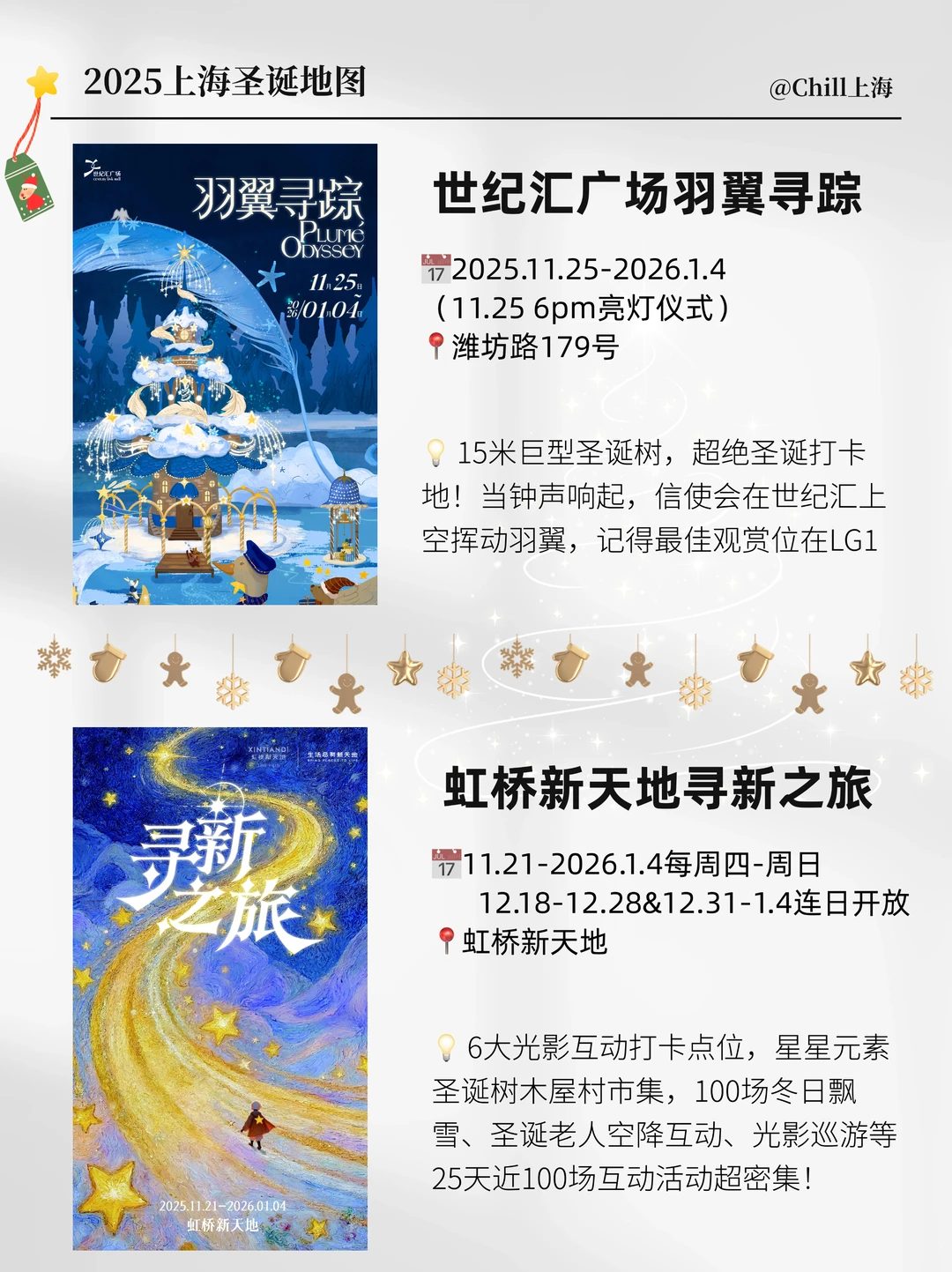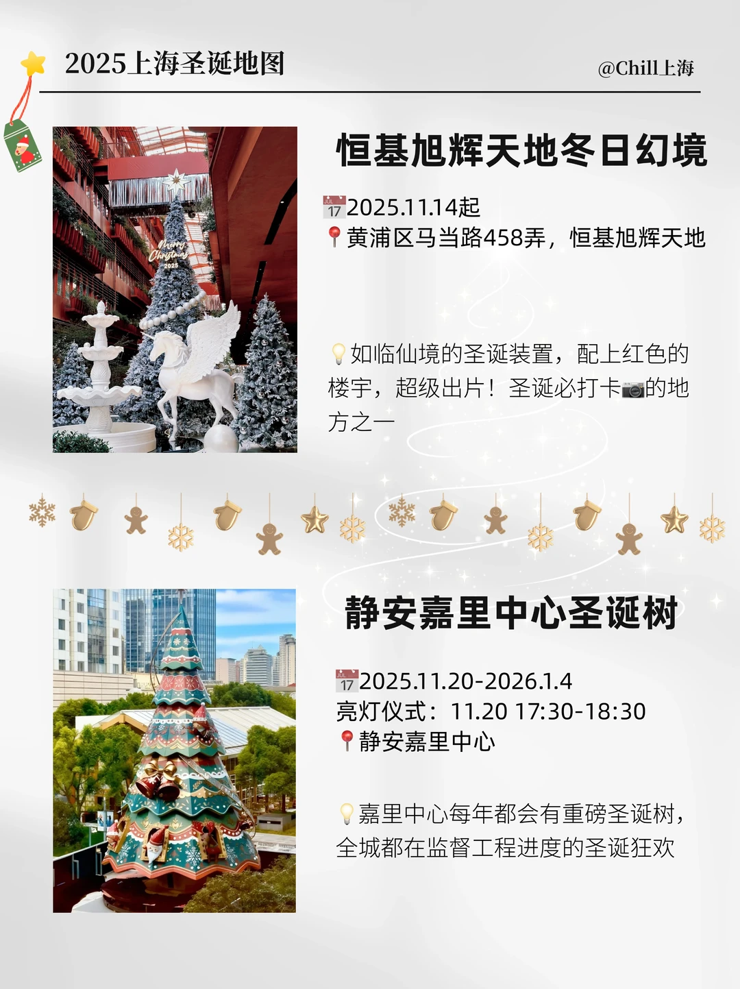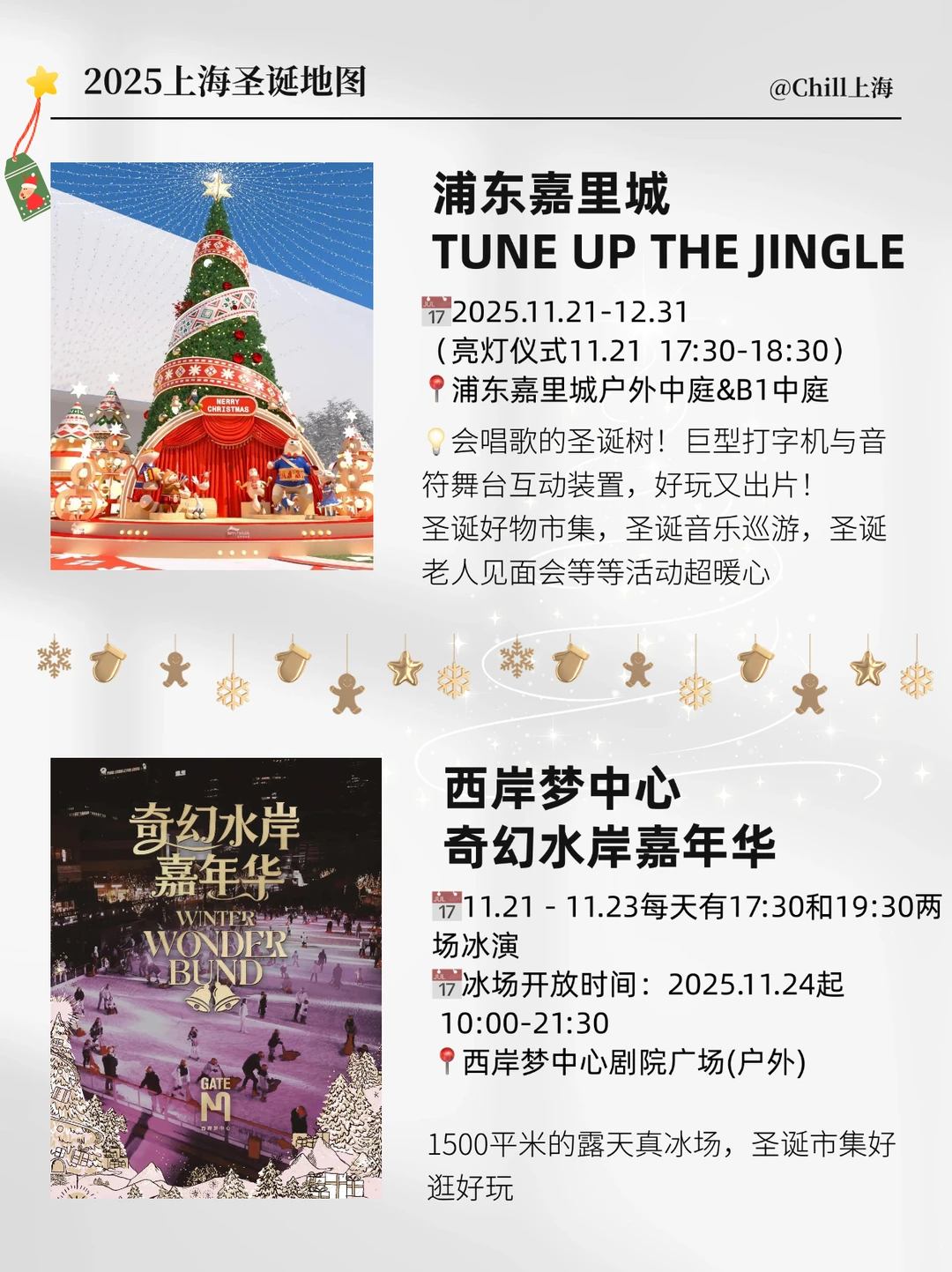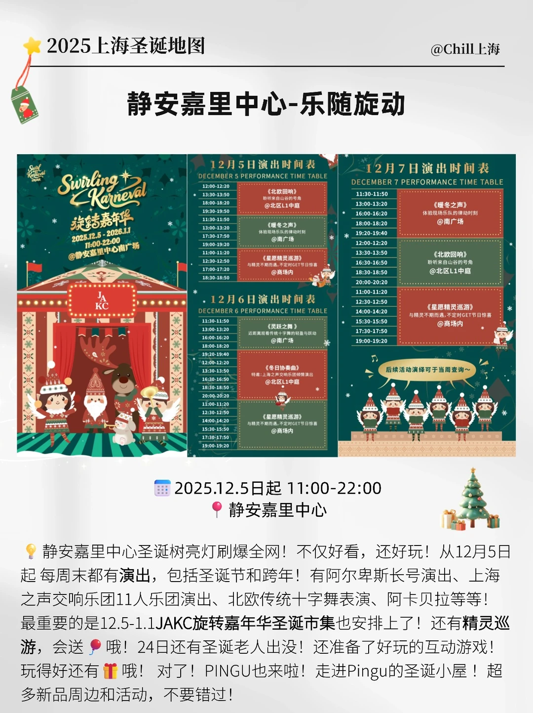 ⭐️静安嘉里中心:今年的圣诞树刷爆全网!从12月5日起,每周末都有专业乐团的演出,包括圣诞节和跨年!还有精灵巡游,圣诞老人出没!最重要的是12.5-1.1JAKC旋转嘉年华圣诞市集也安排上了!这次Pingu也来啦!走进Pingu的圣诞小屋 !超多新品周边和活动,不要错过!