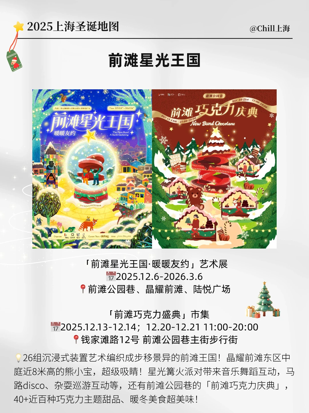 ⭐️ 前滩星光王国:💡法国艺术家绘本里的角色跳出书页啦!26 组沉浸式装置还原屋顶送别、森林车站等童话场景,织就治愈感拉满的前滩星光王国!夜间杉果乐园还有奥地利艺术家打造的奇幻灯光小径,星光闪烁超梦幻!晶耀前滩东区中庭还有近8米高的熊小宝!📷超级出片!12.13起连着2个周末,沪上首个巧克力主题市集甜蜜开摊!超40家近百种巧克力主题甜品,巧克力脑袋不要错过!就在前滩公园巷!