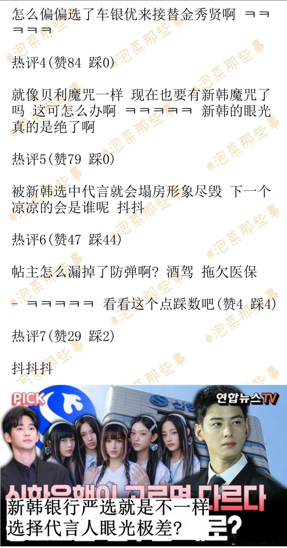 🔥🔥韩网500赞热帖评论翻译🔥🔥新韩银行代言人接连塌房 Prada魔咒2.0?韩网原帖帖主称:新韩银行代言人阵容真心legend 金秀贤 NewJeans 车银优 接二连三塌房 而且其中两组都跟金钱有关 这种程度真的可以说是Prada 2.0了哎cr.pann