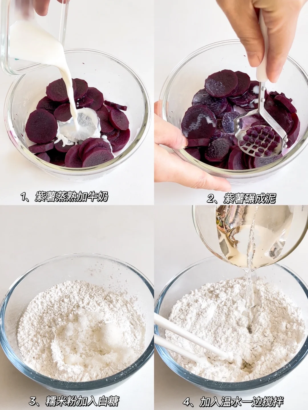 1、紫薯去皮切块,上锅蒸熟,倒入牛奶,压成泥