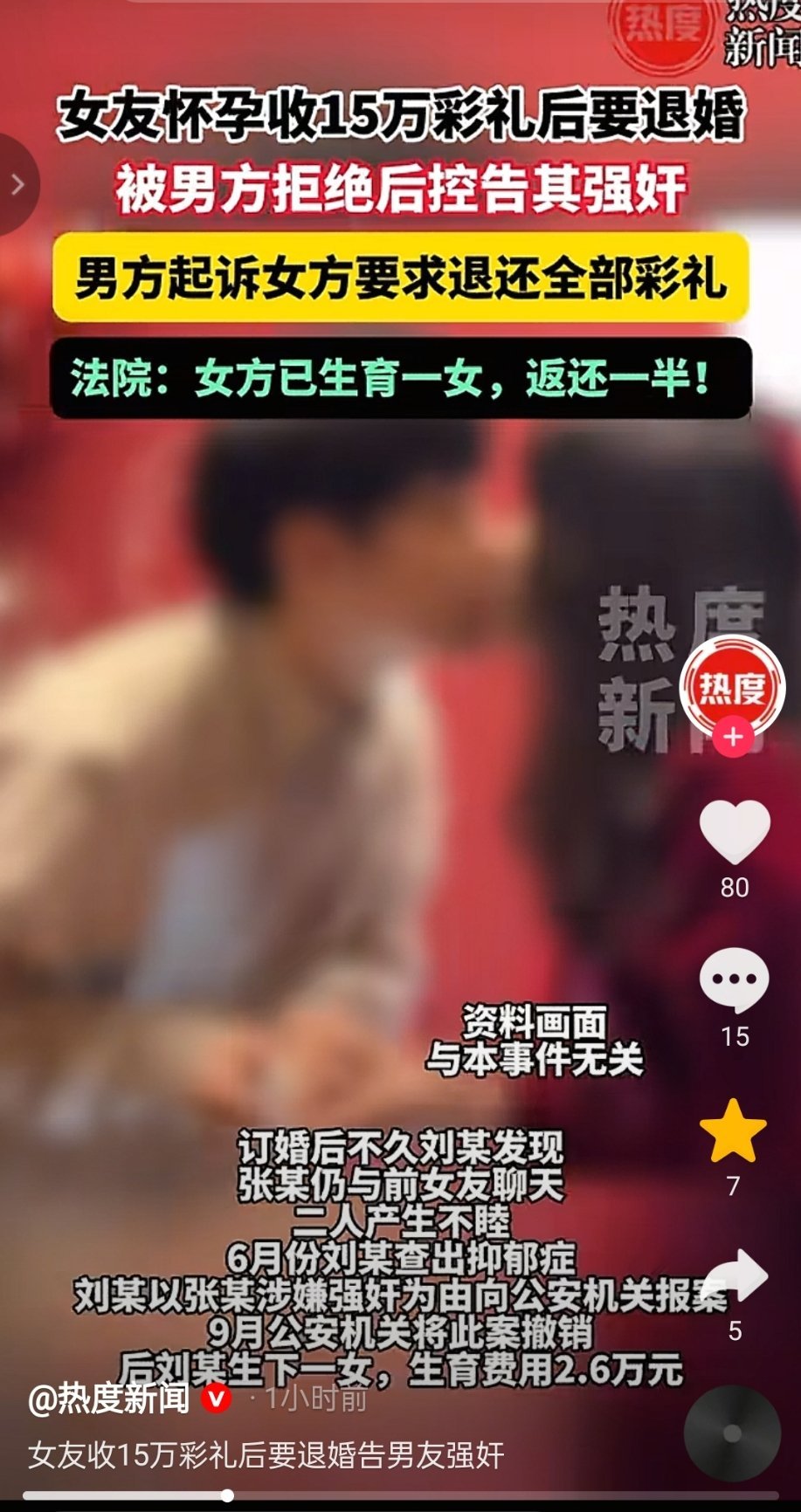 女子怀孕收15万彩礼后要退婚,但一直没退彩礼。女方查出抑郁症,直接控告男方强奸。