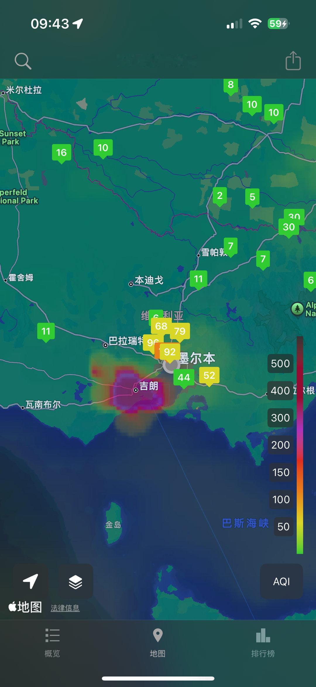 昨天能热到比赛中断球员抽筋,今天反正至少我出门就得长衣长裤了。高温是澳网2026 昨天的一大主角,墨尔本今天的天气话题则是:空气质量。墨尔本空气质量是非常优秀的,全年绿油油。如果空气不好,基本上原因都是:山火燃烧的污染物又飘过来了。山火位置,应该就是地图上墨尔本西南方向紫红色那一块儿。我的手机屏幕上,我是把AQI和UVI都调出来了,不用点进手机里就能看到。墨尔本夏天平时AQI也就二三十,UVI最高竟然能达到12。今天不一样了,AQI要破百了。我对这些事儿就是比较在意,所以我用的空气质量APP就叫在意空气——好丝滑的烂转场我都用了很多年了,也不知道这样的APP是怎么活下来的,也没见到有什么广告。好怕它倒啊,顺路推荐给大家试用。用的人多了,也许就不会倒了。