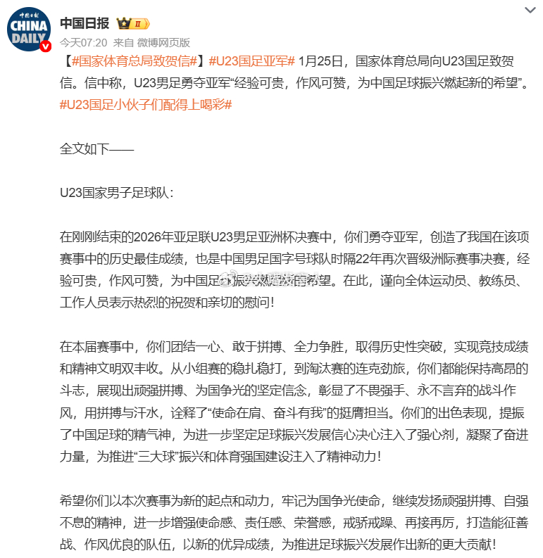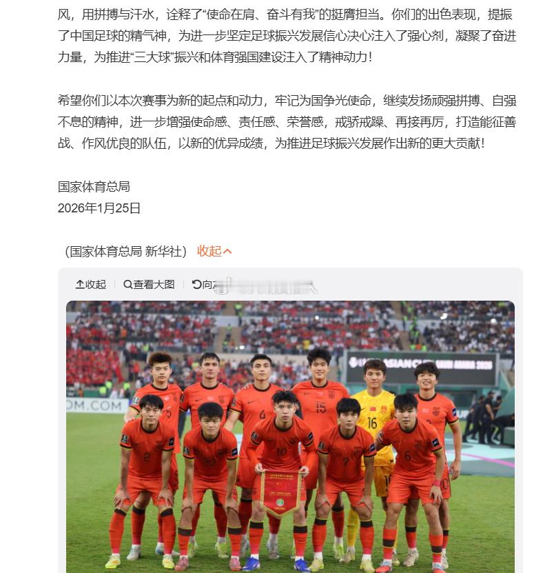 国家体育总局向U23国足致贺信 坦然接受昨天晚上比赛的失利,一次赛事的表现,抹不平中国男足跟日本男足长期的差距感觉差距是全方面的,不只是球员个人脚下技术、思想意识,球队技战术国家体育总局致贺信,U23国足亚军 ,热点观点