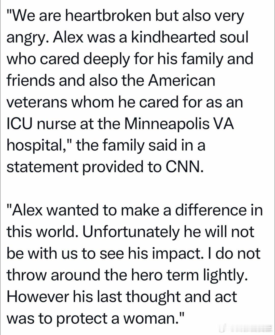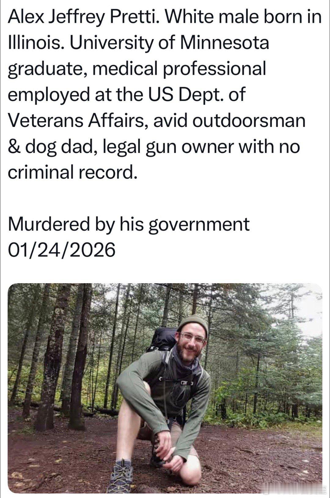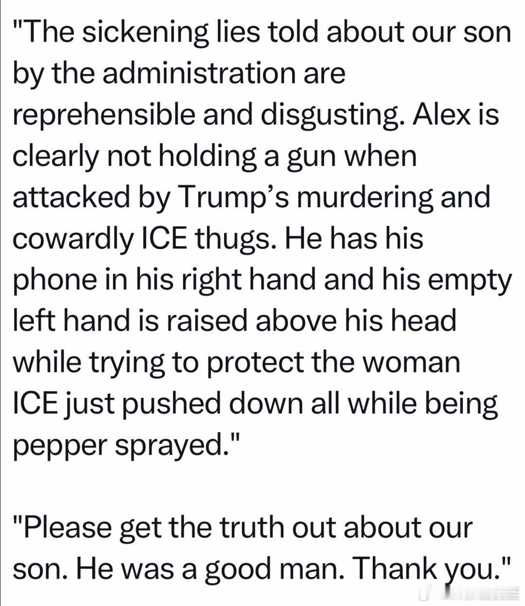 被ICE枪杀的Alex Pretti,其父母发表声明:我们悲愤欲绝,Alex非常善良,在军医院ICU当护士,乐于助人…他在这个世界上做的最后一件事,是保护一位女性,他是个英雄…对他的诽谤污蔑令人作呕,他试图保护女性时,一手拿手机、一手举起,根本没有碰枪…请帮助传播真相,我们的儿子Alex是个好人,谢谢