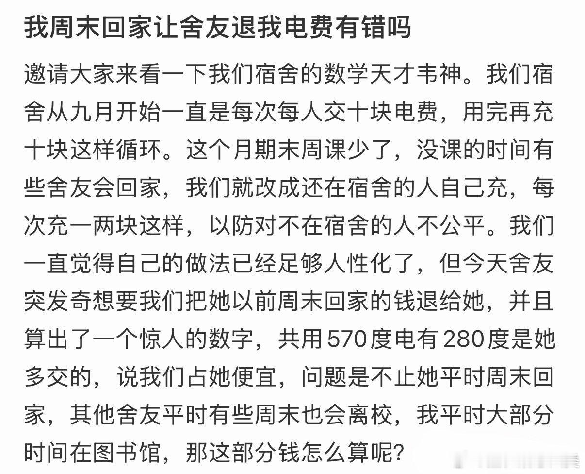 周末回家后,我要求舍友退还我的电费,这是否合理?