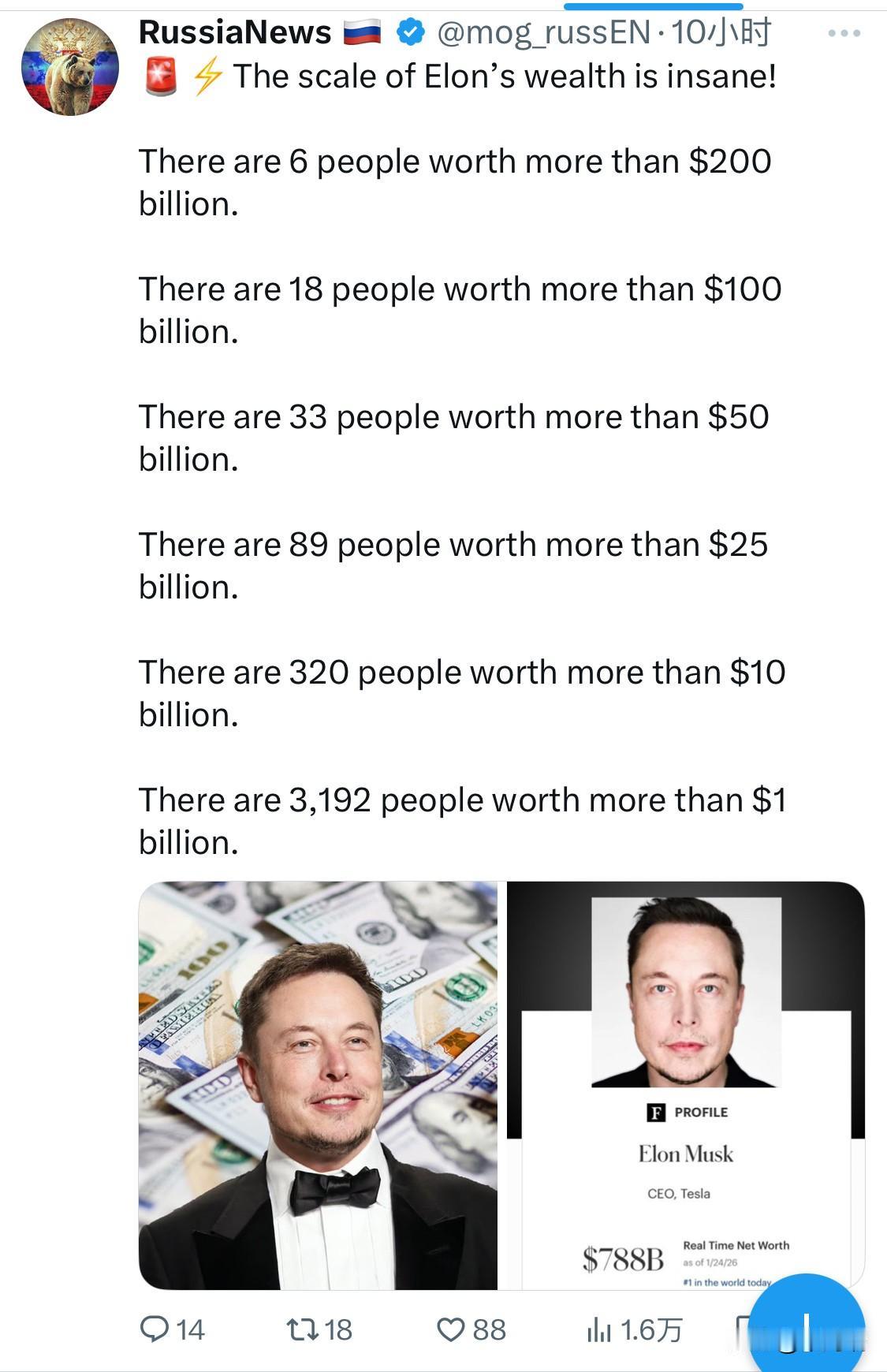 截至2026 年 1 月 24 日,埃隆·马斯克 (Elon Musk) 确实是世界上最富有的人。他的净资产最近达到了创纪录的水平,部分原因是特斯拉 (Tesla) 股价上涨以及其人工智能公司 xAI 的估值增加。 财富概览 净资产: 根据《福布斯》实时亿万富翁榜单,马斯克的净资产估计约为 7880 亿美元。 主要资产: 他的财富主要来自在太空探索技术公司 (SpaceX) 和特斯拉的持股。SpaceX 的估值约为 8000 亿美元,而特斯拉股份也是其财富的重要组成部分。 历史里程碑: 马斯克在 2025 年期间创造了多项财富记录,包括成为第一位净资产超过 5000 亿、6000 亿和 7000 亿美元的人。 未来展望: 2025 年 11 月,特斯拉批准了一项可能价值 1 万亿美元的薪酬方案,如果公司在未来十年达到特定目标,马斯克可能会成为世界上第一位万亿富翁。 马斯克公司 特斯拉 (Tesla): 首席执行官。 SpaceX: 创始人、首席执行官兼首席工程师。 xAI: 创始人(该公司拥有 X,即以前的 Twitter)。 其他: 他还是 The Boring Company 和 Neuralink 的创始人。 总之,埃隆·马斯克的财富规模简直令人难以置信! 全球有6个人身价超过2000亿美元。 全球有18位身价超过1000亿美元的人。 全球有33人的身价超过500亿美元。 全球有89人的身价超过250亿美元。 全球有320人的身价超过100亿美元。 全球有3192人身价超过10亿美元。