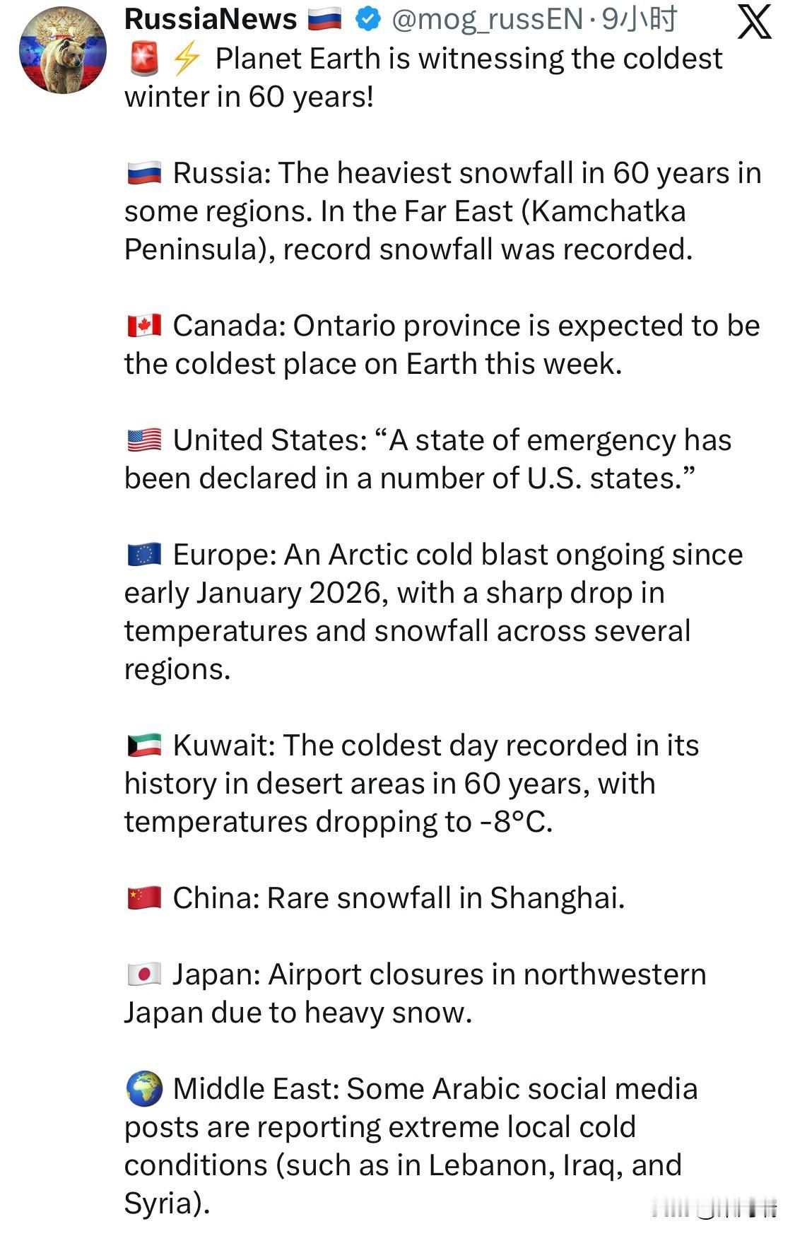地球正在经历60年来最寒冷的冬天! 俄罗斯:部分地区遭遇60年来最大降雪。远东地区(堪察加半岛)创下降雪纪录。 加拿大:预计本周安大略省将成为地球上最冷的地方。 美国:“美国多个州已宣布进入紧急状态。” 欧洲:自 2026 年 1 月初以来,北极寒流持续肆虐,多个地区气温骤降,并出现降雪。 科威特:沙漠地区60年来有记录以来最冷的一天,气温降至-8°C。 中国:上海罕见降雪。 日本:日本西北部因大雪关闭机场。 中东:一些阿拉伯社交媒体帖子报道了极端的局部寒冷天气(例如黎巴嫩、伊拉克和叙利亚)。
