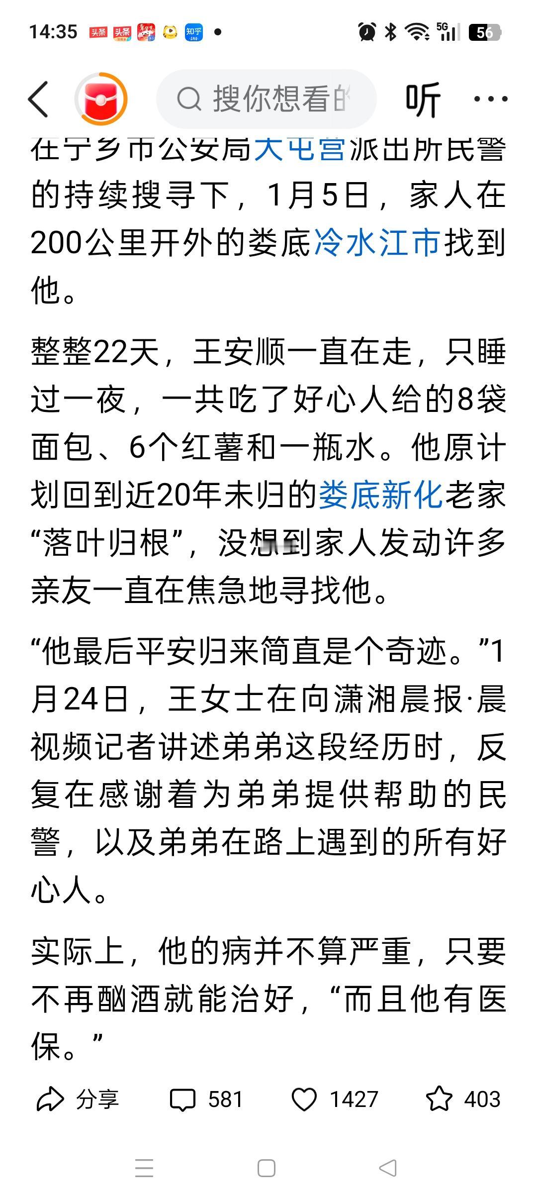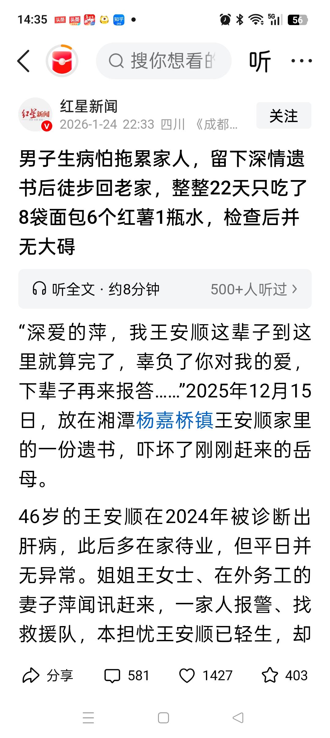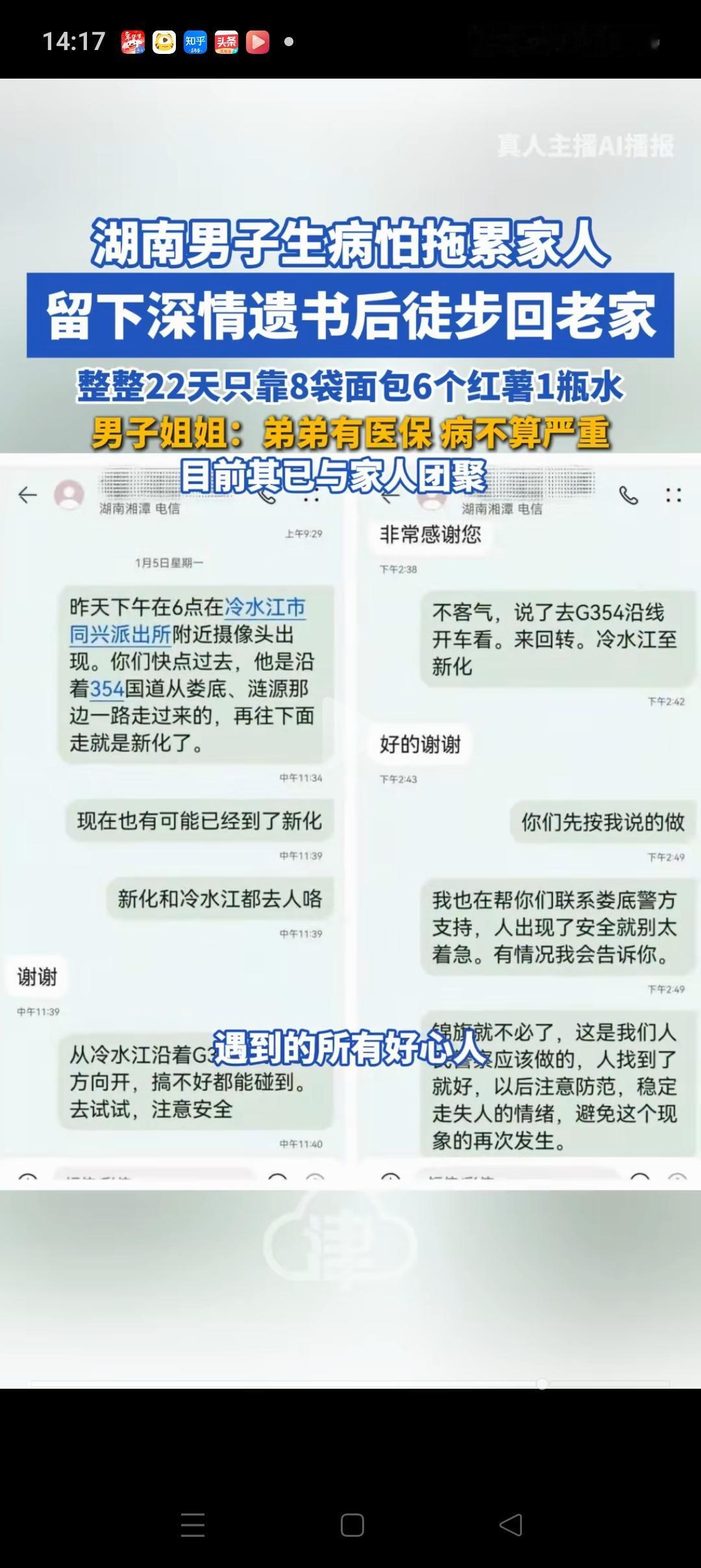 看哭了!46岁男子自觉时日无多,留下一份遗书就离家出走了!他写到“亲爱的萍,我王安顺这辈子到这里就算完了,辜负了你对我的爱,下辈子再来报答”。 原来46岁的他,2024年时被诊断出有肝病,之后就一直待在家里,无法工作。所以他一时想不开,想先回到老家祭拜爷爷奶奶后,就结束自己的一生。 他离家出走时,没有带手机也没有带一分钱。所幸路上遇到了2个好心人,一个给他买了8个面包,1瓶水,一个送了他6个红薯。 就靠这些,他足足撑了22天,一路步行马上就走到老家了。等家人发现他时,已经是个小老头了,身上都臭了。 幸运的是,他的病并无大碍,只要不喝酒完全可以正常生活。 这个男的也是个有责任的汉子,临走前还想着回去看望爷爷奶奶,祝他早日康复吧[祈祷][祈祷]