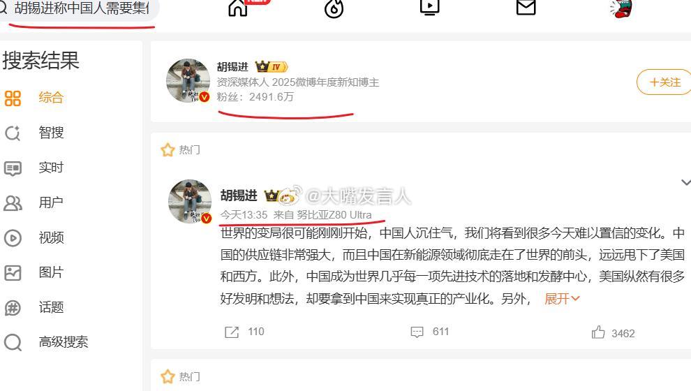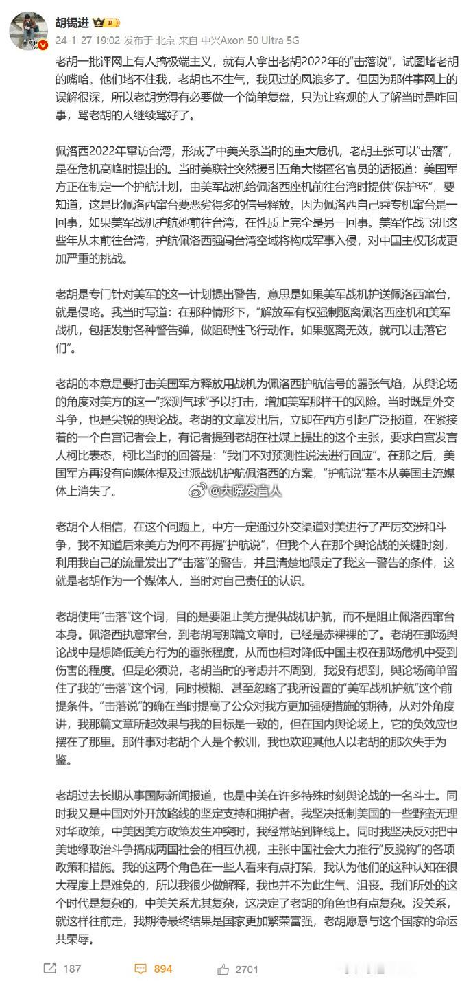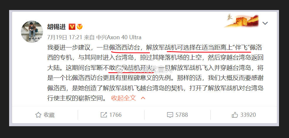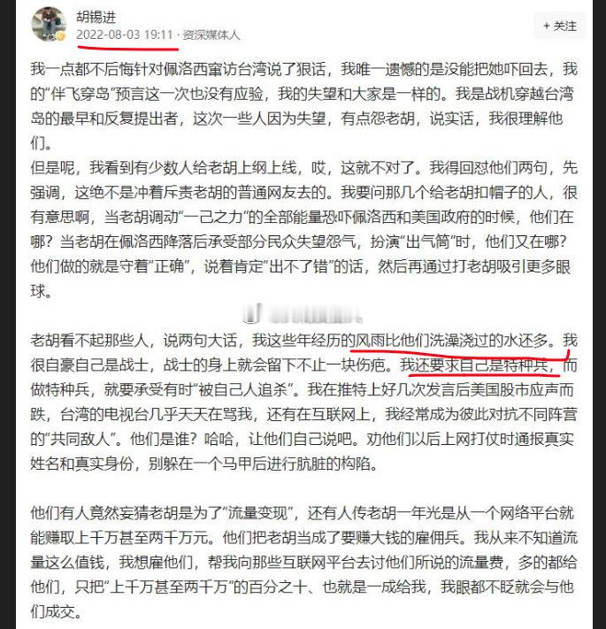胡锡进称中国人需要集体沉住气 建议胡先生自己先沉住气,不要一听见佩骡西到访湾湾,就公开喊伴飞、开火、击落(图3图4图5),结果佩骡西成功降落、第二天平安飞离,胡先生事后还要自找台阶,自封"(网络)特种兵(图6)"热点观点