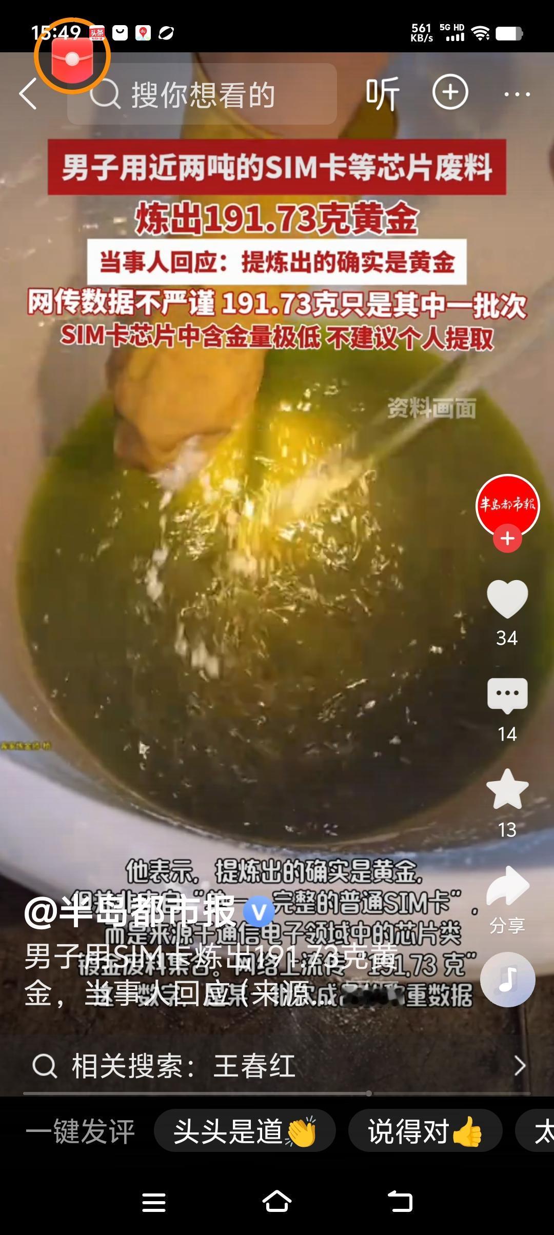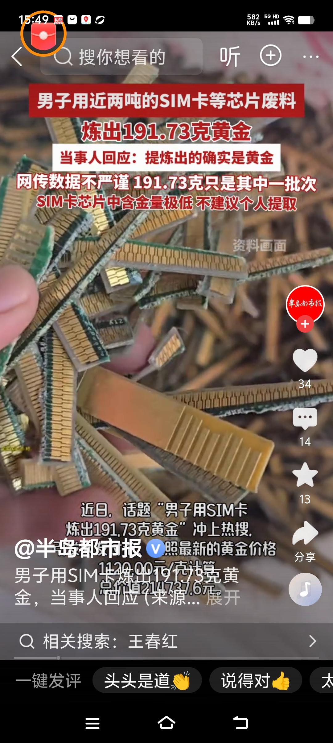 黄金可真是金贵,但是一男子竟然从SIM卡芯片中找到了黄金,用炼金术提炼出191.73克黄金,消息一出一下冲上了热搜! 200来克的黄金价格不菲,可是男子及时声明,这可不是谁都可以从SIM卡芯片就能提炼出来的啊! 第一是需要技术工艺,一般人你别想达到。 第二SIM卡芯片中 含金量极低,人家是以吨位单位才可以提炼的,可不是你随便弄几张就能出黄金的? 所以提炼黄金普通人甭想尝试,这财,不是普通人能发的!