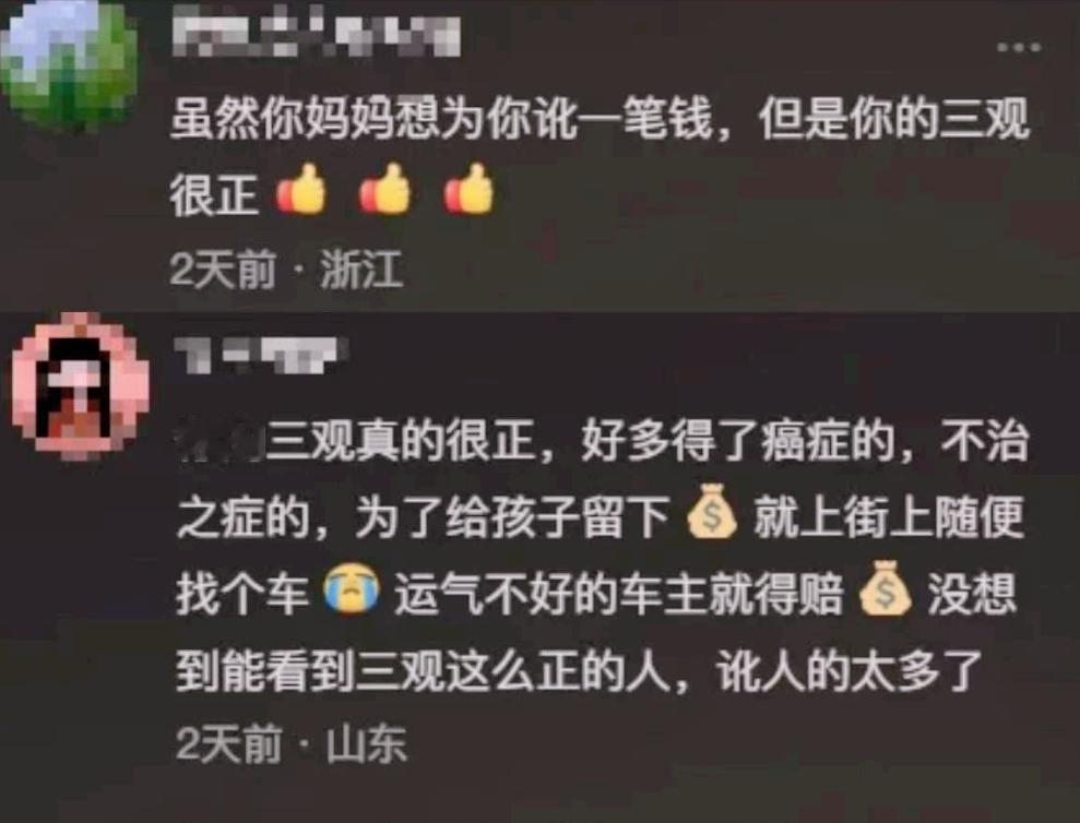 底层互助不是合谋作恶. 武汉街头,患癌的老母亲为了给儿子省点药钱,豁出老脸去碰瓷。儿子熊天琪没在那儿表演什么母慈子孝的感人戏码,而是对着亲妈劈头盖脸一顿暴吼:你是人吗? 甚至还录下视频发到网上自揭家丑,只为提醒司机躲避。 这确实很丑,但丑得见底才显出真善。 这故事也是一记响亮的耳光,扇在了那些习惯性和稀泥的人脸上。 别拿母爱给罪恶开光了。 很多人看到这里会说、哎呀,老人家也是为了儿子,母爱伟大啊。收起这套廉价的自我感动吧。母爱固然伟大,但如果这份爱要靠拉一个无辜的司机下水、靠勒索别人的保险费来成全,那这爱就是带毒的匕首。 现实中多少碰瓷现场的儿女成了帮凶?他们理直气壮地喊着不是你撞的你为什么要扶,本质上是把自家生活的重担,蛮横地转嫁给路人的良知。那种爱,关起门来是苦难,打开门来全是恶。 尊严不是给别人看的。 熊天琪在视频里写:活着一定要有尊严吗? 我看他活得比谁都有尊严。真正的尊严,不是在邻里乡亲面前维持一个体面的假象,而是在穷途末路时,依然守得住那条名为不害人的底线。 他把母亲的丑事摊在阳光下,是在自救也是在救人。他明白一个最朴素的真理:如果今天他接受了母亲讹来的钱,他这辈子就再也站不直了。他用一种近乎残酷的清醒,割裂了贫穷与无耻的必然联系。 良知才是唯一的保险。 这个世界之所以还能让人感到一丝暖意,不是因为那个母亲想去碰瓷,而是因为这个儿子亲手掐死了那点恶念,最后网友们又用善意接住了他的正直。 如果每个人都觉得我穷我有理、你有保险你就该赔我,那社会迟早会变成一个巨大的互害黑洞。到时候,真正需要救助的人,只会淹死在信任崩塌的唾沫星子里。 穷,可以去求助,可以去拼命,但唯独不能去祸害。爱不应该是作恶的遮羞布,贫穷更不是勒索的通行证。