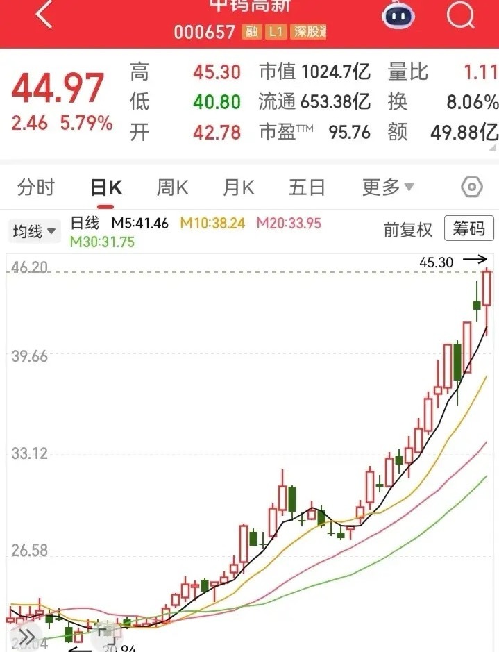从20多升到了40多,走势一下子就翻倍了。整个走势依托于五日均线,有节奏的向上盘