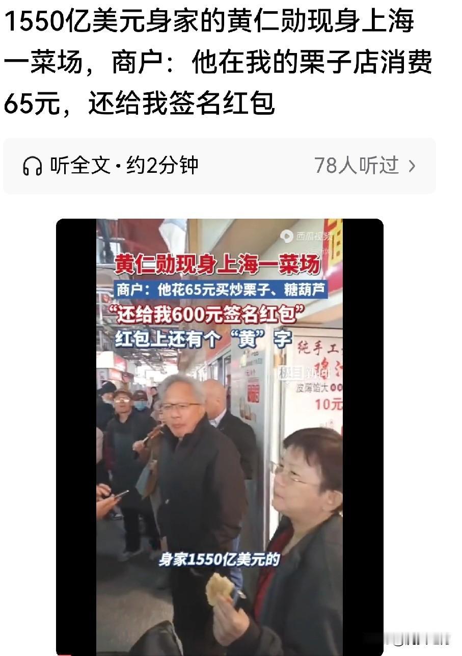 曝全球排第九的富豪黄仁勋现身上海一菜市场,商户:他在我栗子店消费65元,还给我签名红包。 网友1:虽与黄世仁有一字之差,但本质都一样,为富不仁,压榨牛马剩余价值。 网友2:接地气。 评:一个菜市场的65元栗子,扯出两种天差地别的视角,挺有意思的。有人看见富豪走下神坛的接地气,有人盯着资本背后的财富逻辑,说到底,不过是大家站在不同位置,看到了同一件事的不同面。 黄仁勋逛菜场买栗子、给签名红包,于细节里是放下身段亲民,烟火气的互动确实消解了顶级富豪的距离感,也难怪有人觉得接地气;但网友扯出“为富不仁”的吐槽,也并非单纯的抬杠,而是当下不少人对资本原始积累、财富分配失衡的情绪投射——毕竟在普通人的体感里,顶级富豪的财富版图,终究和无数打工人的劳动价值紧密挂钩,这种情绪的存在,本就是现实的一面镜子。 说到底,富豪的烟火气是真的,普通人对财富与劳动的思考也是真的。一个日常的消费瞬间,被解读出不同味道,不过是人间百态的小小缩影罢了。