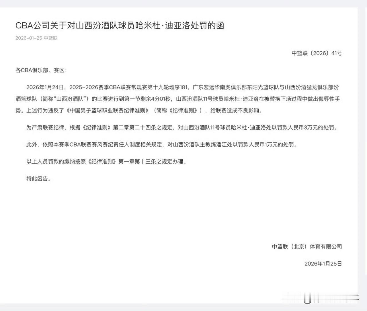 好消息!CBA终于对山西外援做出处罚啦!不过处罚的并不是他在场上那些伤人的小动作,而是在昨晚对阵广东男篮的比赛中,对着裁判做“数钱”动作,CBA公司最终仅仅是对迪亚洛做出了处罚30000元,以及山西男篮主教练潘江处罚10000元,说实话,这处罚并不算重啊!山西男篮