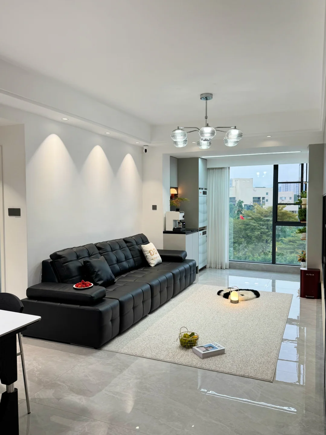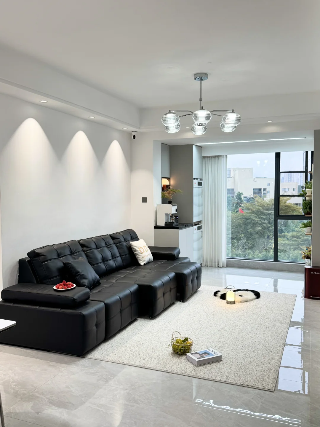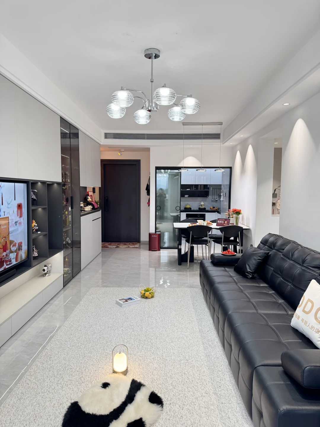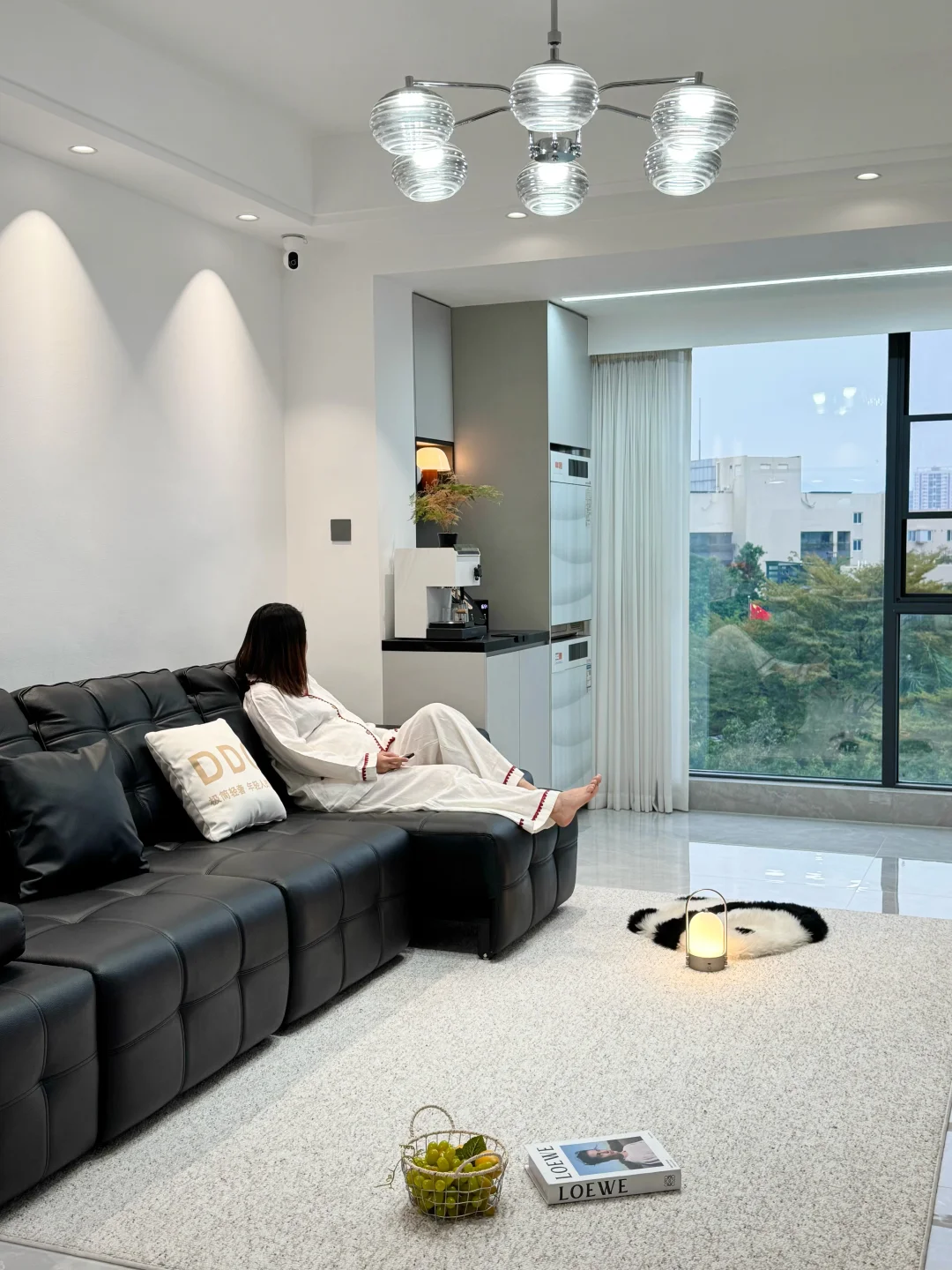 关于我的🏠 面积:建面79平,套内63~ 户型:三室两厅单卫单阳台 收房后花了半年时间装修布置入住 全屋我们选了黑白灰的基调、墙面留白 打通阳台,客厅开间3.5米,不算宽 却恰好营造出一种舒适感☕️ 在这个简约的空间里,DDC的劳伦斯沙发床成了我最常停留的地方🛋️ 黑色的皮质与整屋色调完美融合 日常脏了擦一擦就干净~ 它有三种形态:日常是整洁的直排沙发 偶尔调成贵妃榻窝着看书☕️ 全展开时变成一张临时的床 坐垫支撑有力,靠背贴合腰脊 靠着的时候整个人都被稳稳托住 现在孕期久坐在沙发上追剧也不会觉得腰酸背痛💆 除了可以遥控还可以语音智能控制很方便~ 宅家时光老公在厨房做饭,我在客厅放松追剧,日子平淡又幸福~结婚真好有自己的家真好💕