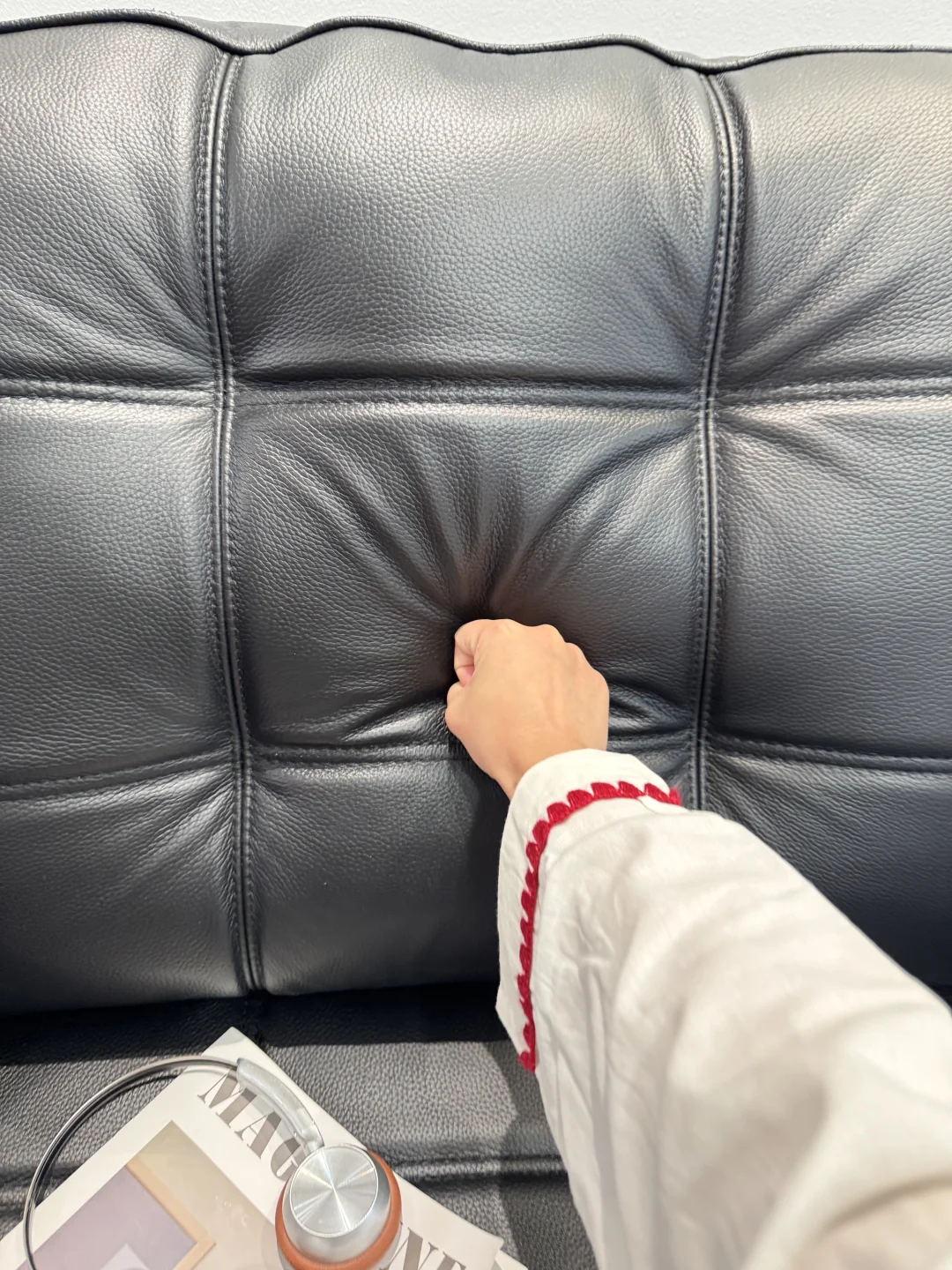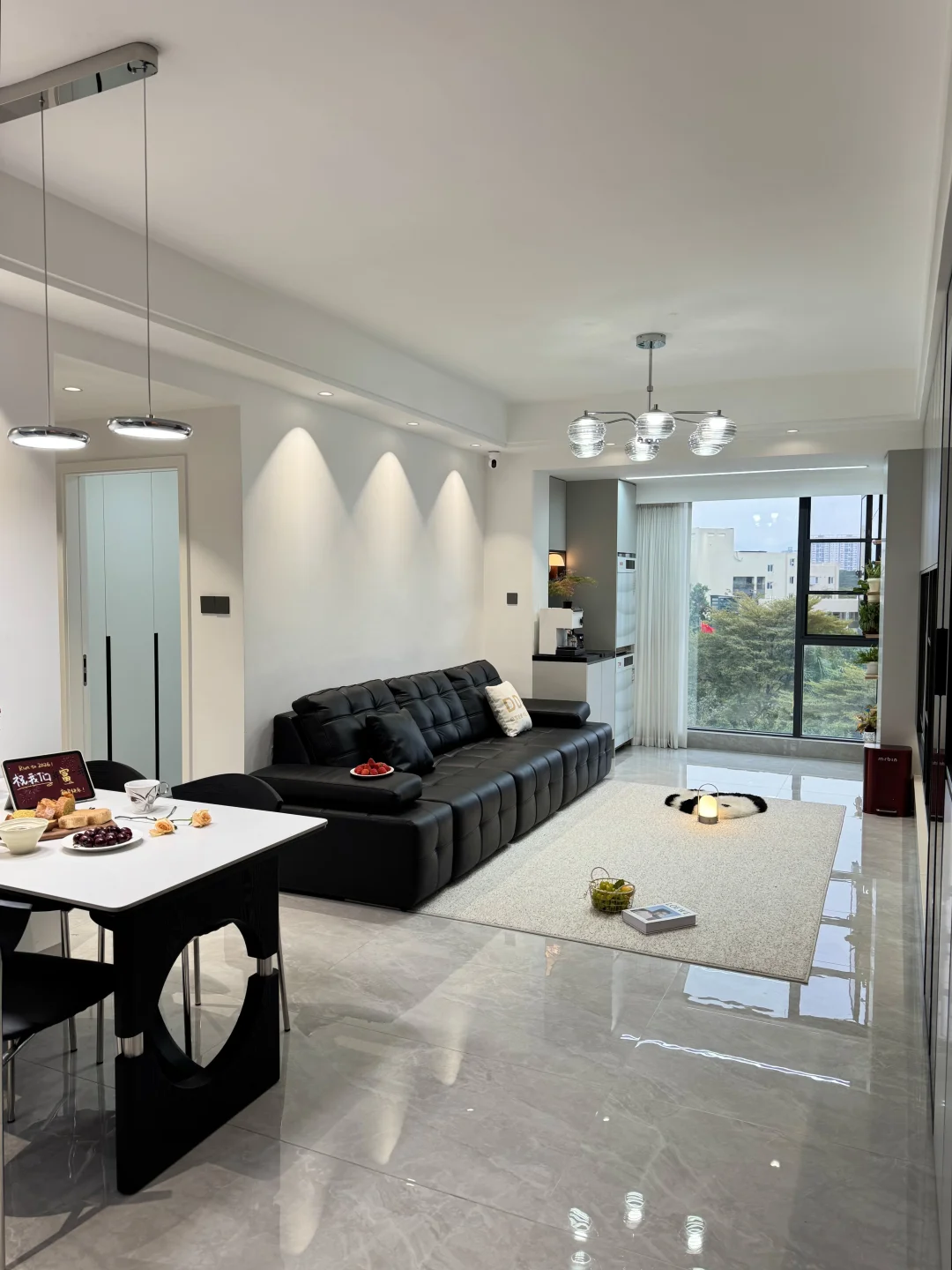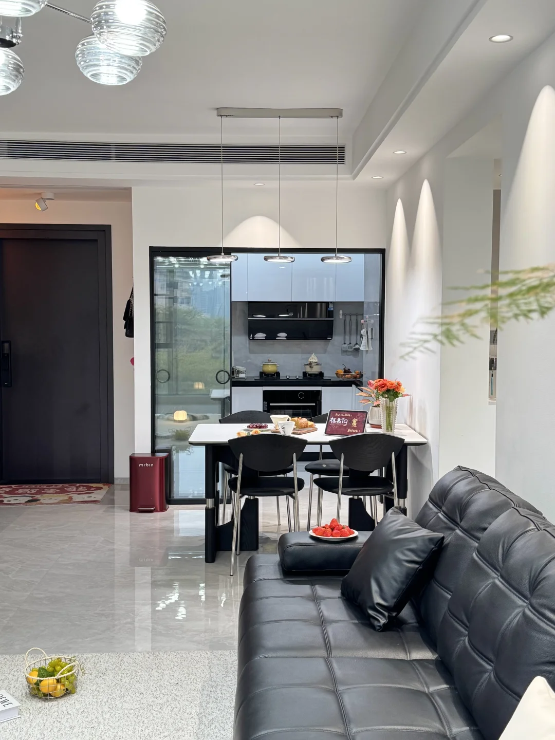 关于我的🏠 面积:建面79平,套内63~ 户型:三室两厅单卫单阳台 收房后花了半年时间装修布置入住 全屋我们选了黑白灰的基调、墙面留白 打通阳台,客厅开间3.5米,不算宽 却恰好营造出一种舒适感☕️ 在这个简约的空间里,DDC的劳伦斯沙发床成了我最常停留的地方🛋️ 黑色的皮质与整屋色调完美融合 日常脏了擦一擦就干净~ 它有三种形态:日常是整洁的直排沙发 偶尔调成贵妃榻窝着看书☕️ 全展开时变成一张临时的床 坐垫支撑有力,靠背贴合腰脊 靠着的时候整个人都被稳稳托住 现在孕期久坐在沙发上追剧也不会觉得腰酸背痛💆 除了可以遥控还可以语音智能控制很方便~ 宅家时光老公在厨房做饭,我在客厅放松追剧,日子平淡又幸福~结婚真好有自己的家真好💕