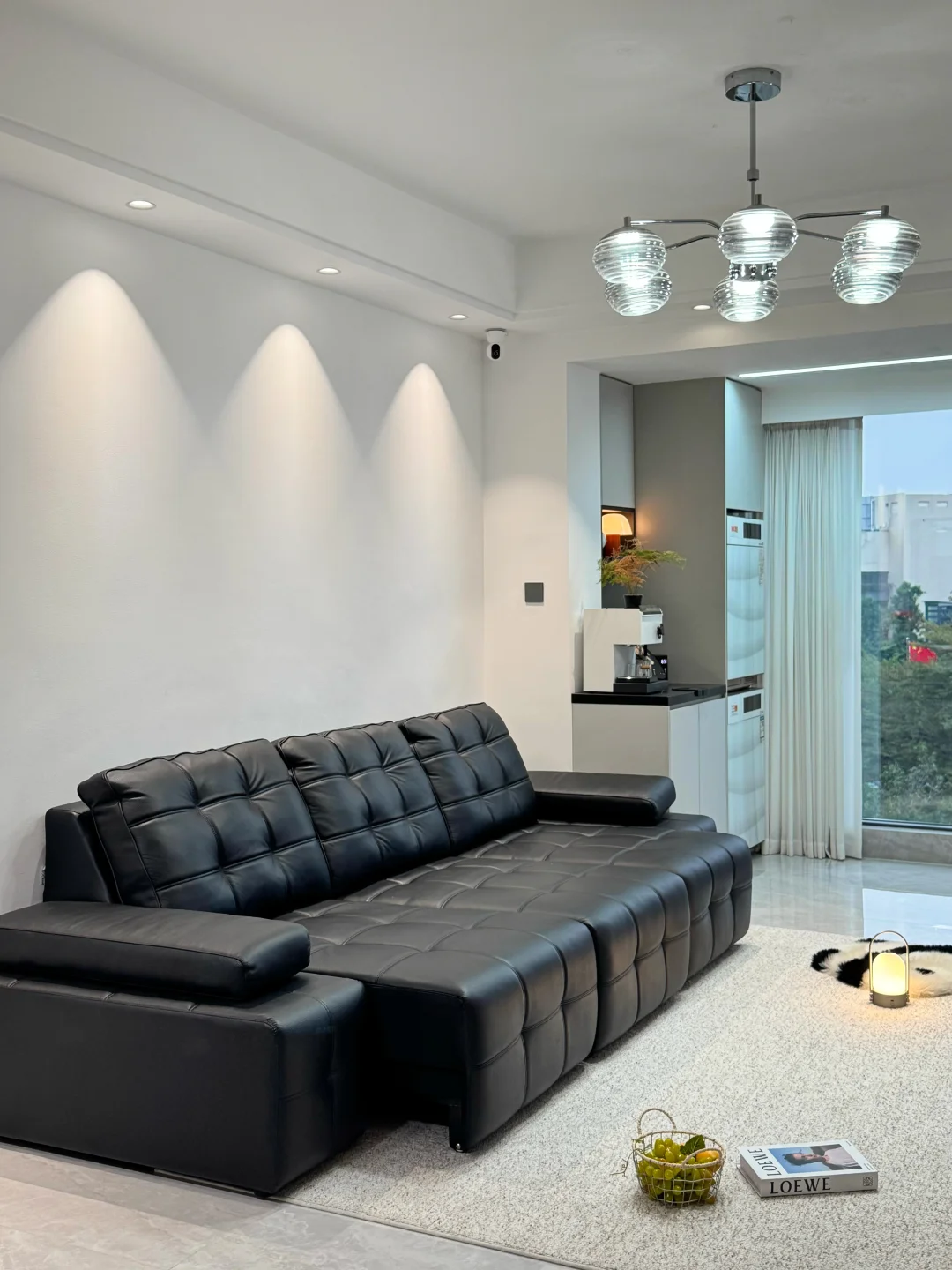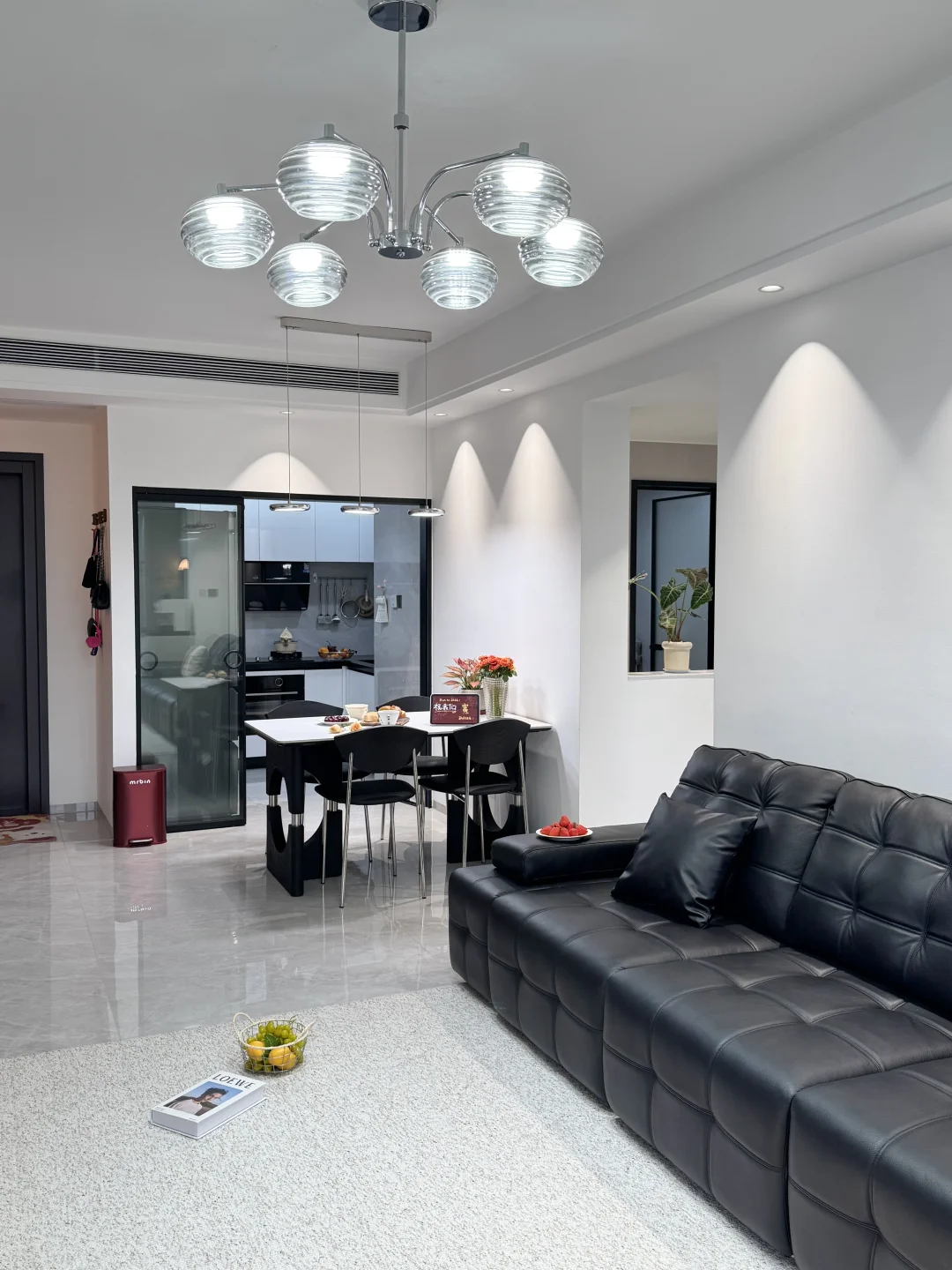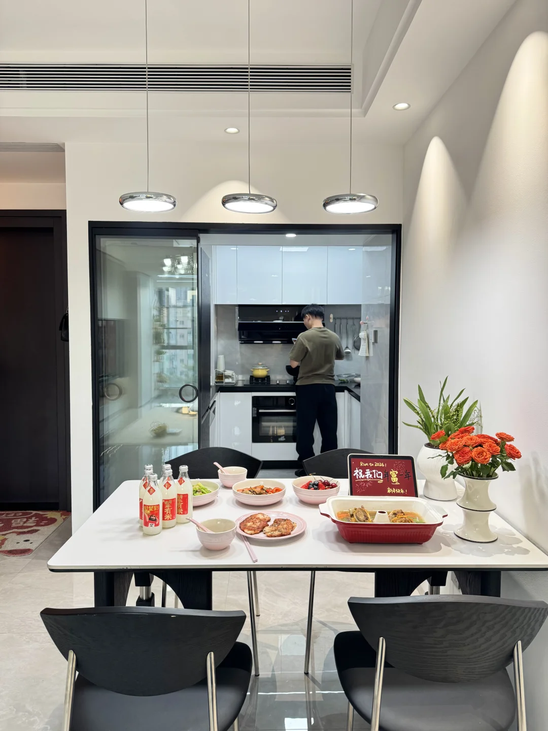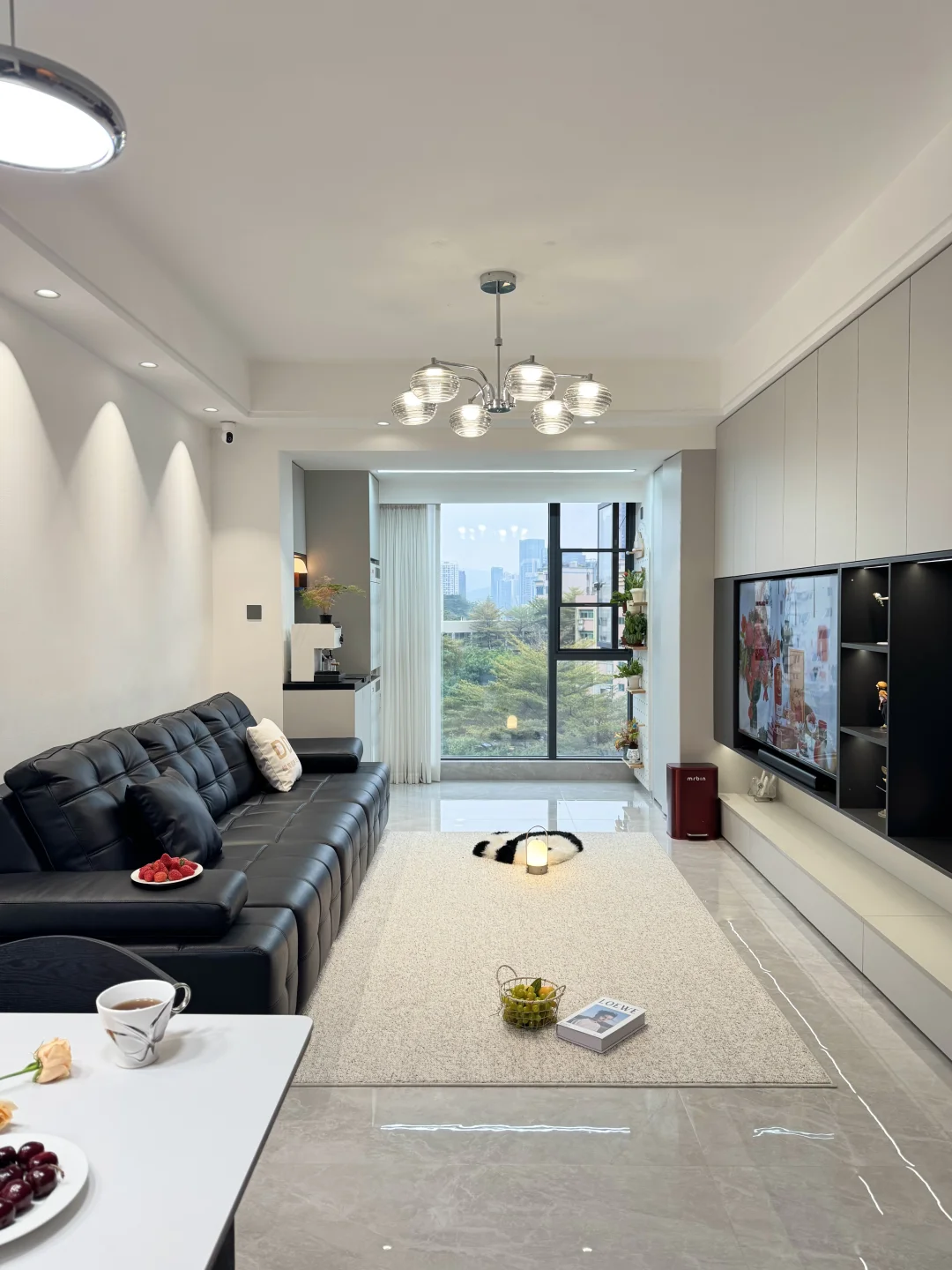 关于我的🏠 面积:建面79平,套内63~ 户型:三室两厅单卫单阳台 收房后花了半年时间装修布置入住 全屋我们选了黑白灰的基调、墙面留白 打通阳台,客厅开间3.5米,不算宽 却恰好营造出一种舒适感☕️ 在这个简约的空间里,DDC的劳伦斯沙发床成了我最常停留的地方🛋️ 黑色的皮质与整屋色调完美融合 日常脏了擦一擦就干净~ 它有三种形态:日常是整洁的直排沙发 偶尔调成贵妃榻窝着看书☕️ 全展开时变成一张临时的床 坐垫支撑有力,靠背贴合腰脊 靠着的时候整个人都被稳稳托住 现在孕期久坐在沙发上追剧也不会觉得腰酸背痛💆 除了可以遥控还可以语音智能控制很方便~ 宅家时光老公在厨房做饭,我在客厅放松追剧,日子平淡又幸福~结婚真好有自己的家真好💕