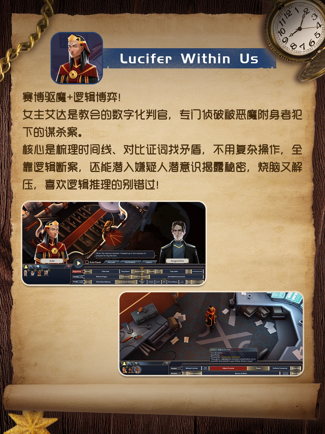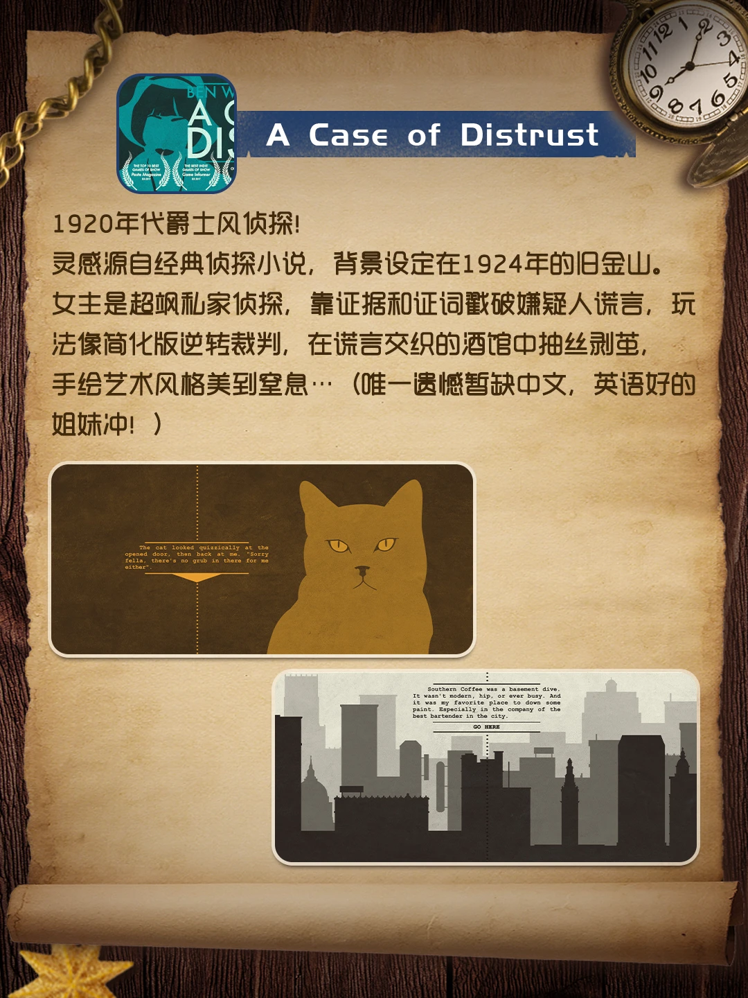 悬疑脑的快乐全被这高智商侦探游戏承包了[黄金薯R]从复古推理到高科技探案,从硬核烧脑到轻松治愈,主角全员大女主[赞R] 豪麻-黑色推理-氛围感封神的赛博侦探剧! A Case of Distrust -1920年代爵士风侦探! Kathy Rain: Director's Cut-90年代复古像素风yyds! 珍妮的线索-软萌手绘风+成长向悬疑! Lucifer Within Us-赛博驱魔+逻辑博弈! 罪城骇客-黑客少女在线破案! 玩过的姐妹交出你的宝藏款[得意R]