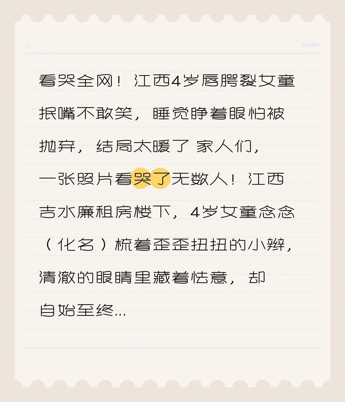看哭全网!江西4岁唇腭裂女童抿嘴不敢笑,睡觉睁着眼怕被抛弃,结局太暖了 家人们,一张照片看哭了无数人!江西吉水廉租房楼下,4岁女童念念(化名)梳着歪歪扭扭的小辫,清澈的眼睛里藏着怯意,却自始至终紧紧抿着嘴——先天三度唇腭裂在她嘴角留下的痕迹,让她连笑都不敢尽兴,更让人心碎的是,她晚上睡觉都不敢闭紧眼睛,生怕一睁眼,家人就会抛弃她。 这张被网友随手拍下的照片,短短3天就在全网掀起爱心风暴。念念的家境藏着太多无奈:父母常年在外打零工糊口,年过六旬的爷爷奶奶靠着低保和几亩薄田,拉扯着两个孙女长大。医生说,唇腭裂需要3-4次修复手术,总费用要好几万,这对这个贫困家庭来说,简直是一座翻不过的大山。 更让人心疼的是生理缺陷带来的连锁反应:念念吃饭时食物总从鼻孔漏出,长期营养不良,4岁体重才20斤,比同龄孩子瘦了一大圈;幼儿园里小朋友无意的调侃,让原本活泼的她变得越来越沉默,甚至不敢在人前开口说话。奶奶偷偷抹泪说:“她知道自己和别人不一样,连镜子都不敢照。” 而“怕被抛弃”的不安,让她养成了浅眠的习惯,小小的身躯里藏着远超年龄的敏感与脆弱。 就在这个家庭陷入绝望时,第一个转折点来了!照片在社交平台传开后,全网的善意如潮水般涌来:宝妈们连夜整理自家孩子的治愈经历,打字打到手指发酸;医疗从业者主动私信,详细讲解治疗流程、推荐靠谱医院;匿名网友直接转账,备注里只有一句“给孩子买颗糖,让她笑一笑”;曾受公益帮助的主播,更是捐出10万元直言“要为更多孩子撑伞”。 第二个反转更让人暖心:江西省慈善总会主动找上门,带来了“微笑列车”公益项目的好消息——念念可以享受全免费的唇腭裂矫治手术!这个深耕江西24年的项目,已通过19家定点医院,为2.2万余名患儿带去微笑,从筛查、手术到康复全程兜底。江西省儿童医院更是开通绿色通道,多名专家紧锣密鼓制定方案,承诺包揽所有相关费用,念念有望3个月内接受首次手术。 更贴心的是,嫣然天使基金送来特制奶瓶,通过阀门控制流速让喂食效率提升3倍;志愿者还带来了高蛋白营养包,帮念念补充营养、达到手术体重标准。社区工作人员也上门走访,准备根据政策提供后续帮扶。当奶奶握着特制奶瓶,看着念念一口气喝下200毫升营养奶昔时,当场红了眼眶:“从来没想过,素不相识的人会这么帮我们。” 其实唇腭裂从不是不治之症,规范治疗后能恢复接近正常的外观和语言功能。但我国每年约有3万唇腭裂新生儿,还有很多孩子因贫困、信息闭塞错过最佳治疗期。念念是幸运的,她被全网的爱心包围,但这份温暖不该有终点。 从网友的一次转发、一句鼓励,到公益组织的兜底、医护人员的坚守,这场跨越山海的爱心接力,让我们看到了最动人的中国温度。每个孩子都该拥有微笑的权利,每一道“生命的裂隙”,都该被善意与爱填满。 愿念念手术顺利,早日笑出最美的模样;也愿更多困境中的孩子,能被世界温柔以待。你被这份善意打动了吗?评论区聊聊你的感受,点赞转发,让更多人知道这份温暖,也为善良接力!