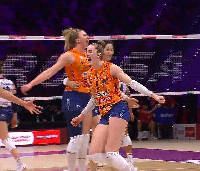 朱婷 ,第三局26分这个后撤中的扣球,太强了,帮助科内拿到赛点,然后拦住博赛蒂,3比0取胜斯坎迪奇,拿到意大利杯赛的冠军!这也是科内利亚诺继超级杯和世俱杯失利决赛后,拿到份量很重的一个冠军,恭喜科内,恭喜朱婷!排球朱婷